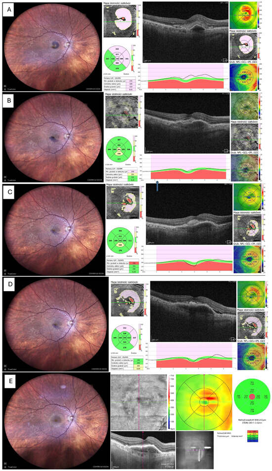 Resolution of haemorrhage with restoration of foveal contour. (A) Fundus photo and OCT before tPA + gas administration. (B) Fundus photo and OCT 14 days after tPA + gas, showing significant reduction in haemorrhage and retinal thickness; the patient received the first intravitreal aflibercept 2 mg (Eylea 2 mg, Bayer, Leverkusen, Germany). (C) Fundus photo and OCT 1 month postoperatively (only small remnants of blood visible). (D) Fundus photo and OCT 3 months postoperatively, patient on aflibercept 2 mg T&Ex regimen. (E) Fundus photo and OCT 6 months postoperatively, no blood visible but MNV still active, requiring continuation of anti-VEGF therapy. Foveal contour preserved.