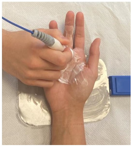 Since no standardized TECAR protocols for TF currently exist, a reproducible treatment protocol was developed. In detail, Tecar therapy was delivered using the VEGA device (BAC s.r.l., Florence, Italy), which incorporates both capacitive and resistive modes within a single bipolar electrode. Each treatment session lasted 20 min and was performed twice a week, for 8 weeks, which is consistent with previous literature [48,49,50,51]. The device was set in thermal mode, with power calibrated between 30 and 40% of the device’s maximum output, which allows to achieve deep heating while ensuring patient comfort and safety. The selected operating frequency (500 kHz) and intensity (power output) followed the manufacturer’s recommendations to generate mild, controlled diathermy without overheating the thin palmar soft tissues. The passive electrode was fixed on the dorsum of the hand, while the bipolar electrode was employed on the palmar side and moved by the operator along the flexor tendon path, with a special focus on the A1 pulley area. A layer of high-conductive cream was applied to facilitate the optimal distribution of endogenous heat therapy and effective contact between the electrode and the skin of the treated region. Both capacitive and resistive modes were employed sequentially within the same session. The capacitive mode was applied at the initial phase of treatment to warm the superficial soft tissues (rich in water and electrolytes, such as subcutaneous tissue, microvascular, and lymphatic networks), to reduce superficial inflammation, and facilitate local circulation in the treated area. Subsequently, the resistive mode was applied to target deeper and less hydrated structures with higher electrical resistance (such as tendons, ligaments, A1 pulley), to act specifically on the pathological interface between the flexor tendon and the A1 pulley, representing the primary site of mechanical friction in TF. In addition, as the device did not provide skin-temperature monitoring, safety was ensured by constant feedback gathered from the patients, operator palpation to detect excessive heating, and visual inspection of skin, to ensure a comfortable, warm sensation without causing skin discomfort or burning feeling or pain due to localized overheating (Figure 2).