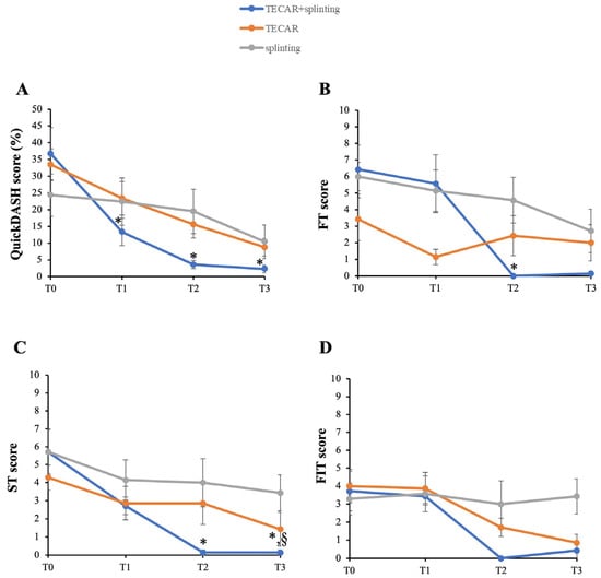 Secondary outcomes with follow-up between groups. (A) QuickDASH; (B) Frequency of triggering (FT); (C) Severity of triggering (ST); (D) Functional impact of triggering (FIT). * p < 0.05 vs. T0 TECAR + splinting; § p < 0.05 vs. other groups.