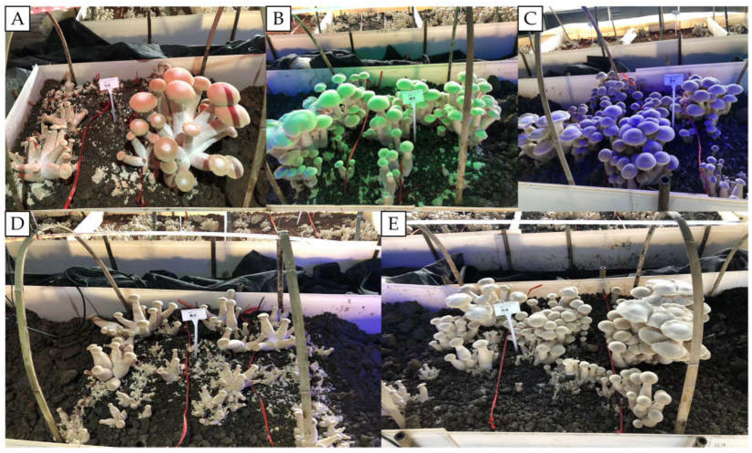 - Chen, X.; Liu, Y.; Guo, W.; Wei, X.; Wang, M.; Zhang, X.; Zheng, W. The Effects of Different Light Qualities on the Growth and Nutritional Components of Pleurotus citrinopileatus. Front. Nutr. 2025, 12, 1554575. [Google Scholar] [CrossRef] [PubMed]