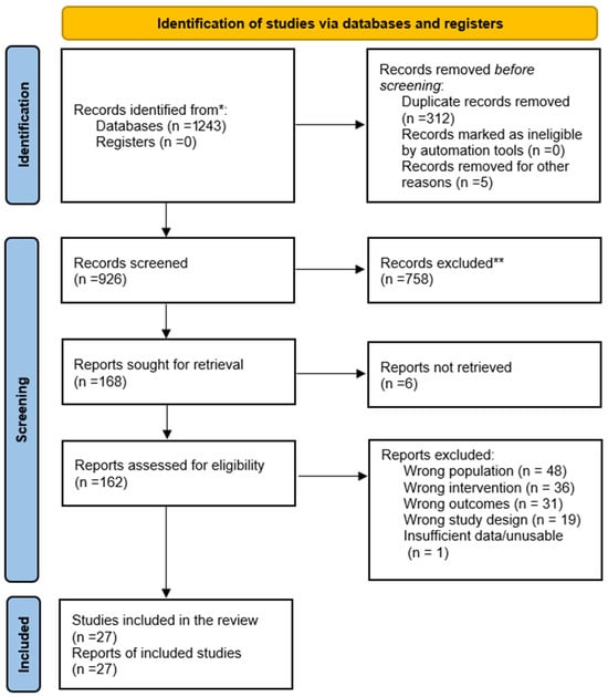- Page, M.J.; McKenzie, J.E.; Bossuyt, P.M.; Boutron, I.; Hoffmann, T.C.; Mulrow, C.D.; Shamseer, L.; Tetzlaff, J.M.; Akl, E.A.; Brennan, S.E.; et al. The PRISMA 2020 Statement: An Updated Guideline for Reporting Systematic Reviews. BMJ 2021, 372, n71. [Google Scholar] [CrossRef]