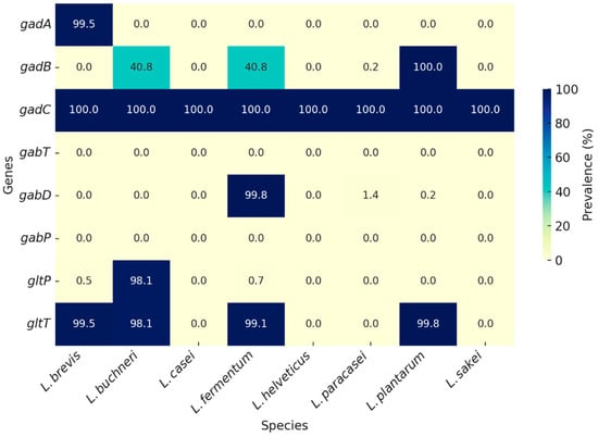 Comparative prevalence of γ-aminobutyric acid (GABA)-related genes across Lactobacillus species. Presence/absence analysis revealed that the glutamate/GABA antiporter (gadC) is universally conserved (100%) across all eight species. In L. plantarum, gadB (100%) was conserved together with gadC and gltT (99.8%), while catabolic genes such as gabT and gabP were absent and gabD was only sporadically present (0.24%). L. brevis exhibited high prevalence of gadA (99.5%) with gadC (100%) and gltT (99.5%), consistent with strong GABA-producing potential. L. buchneri and L. fermentum carried gadB at moderate prevalence (40.8%), with L. fermentum additionally encoding gabD (99.8%), indicating both biosynthetic and catabolic capacity. In contrast, L. casei, L. helveticus, and L. sakei harbored only gadC (100%), suggesting limited intrinsic GABA production. L. paracasei showed a unique intermediate profile with gadB present in a minority of strains (0.2%) alongside universal gadC. Together, these findings highlight species-specific genomic strategies for GABA metabolism, with L. plantarum, L. brevis, and L. fermentum standing out as the strongest candidates for functional food applications.