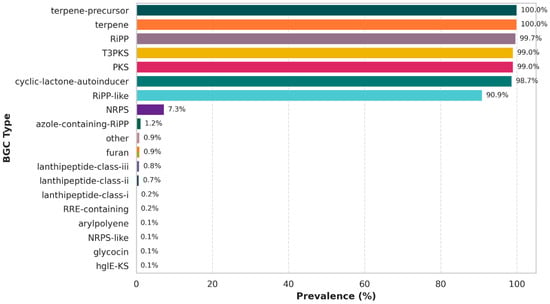 Analysis of secondary metabolite BGCs across 1240 L. plantarum genomes revealed a highly conserved and diverse repertoire (Figure 4). The most prevalent clusters included terpene precursors and terpene synthases, which were detected in all genomes (100%). These clusters are associated with carotenoid- and isoprenoid-related metabolites, which may contribute to oxidative stress tolerance and potential health-promoting functions [74].