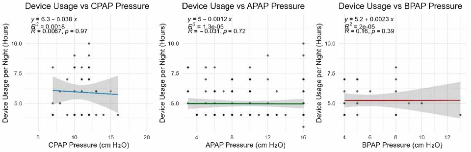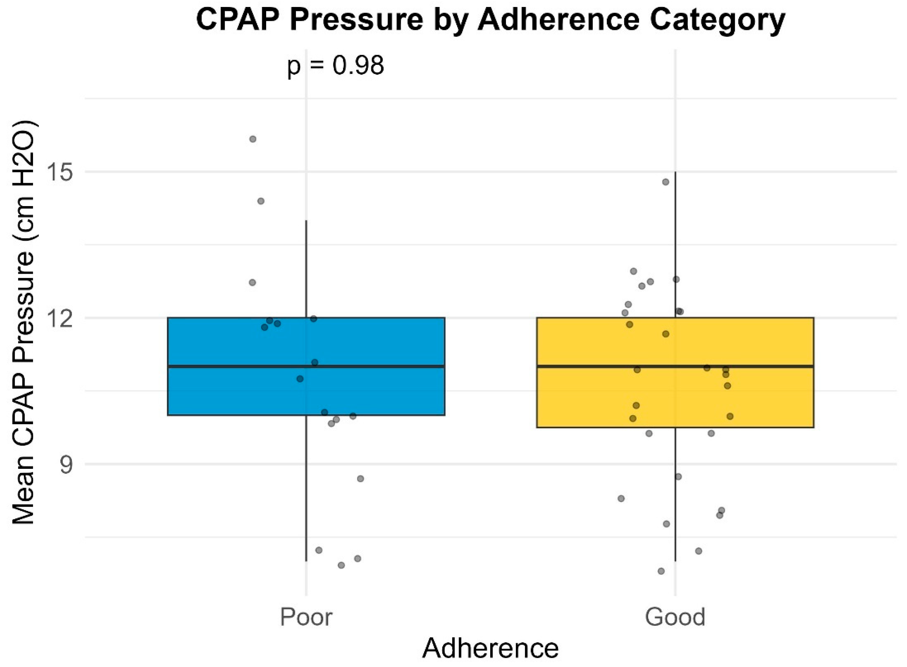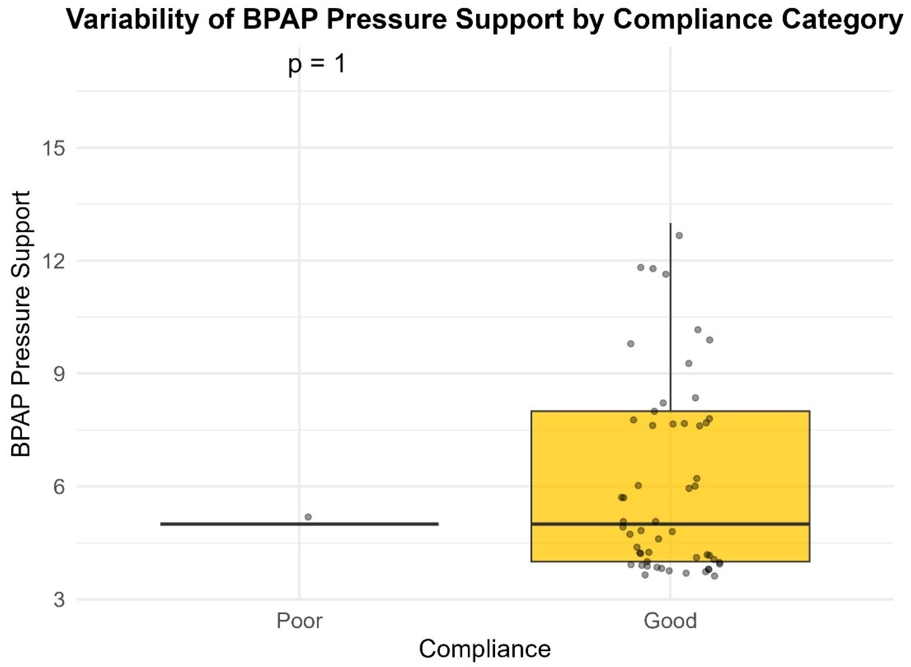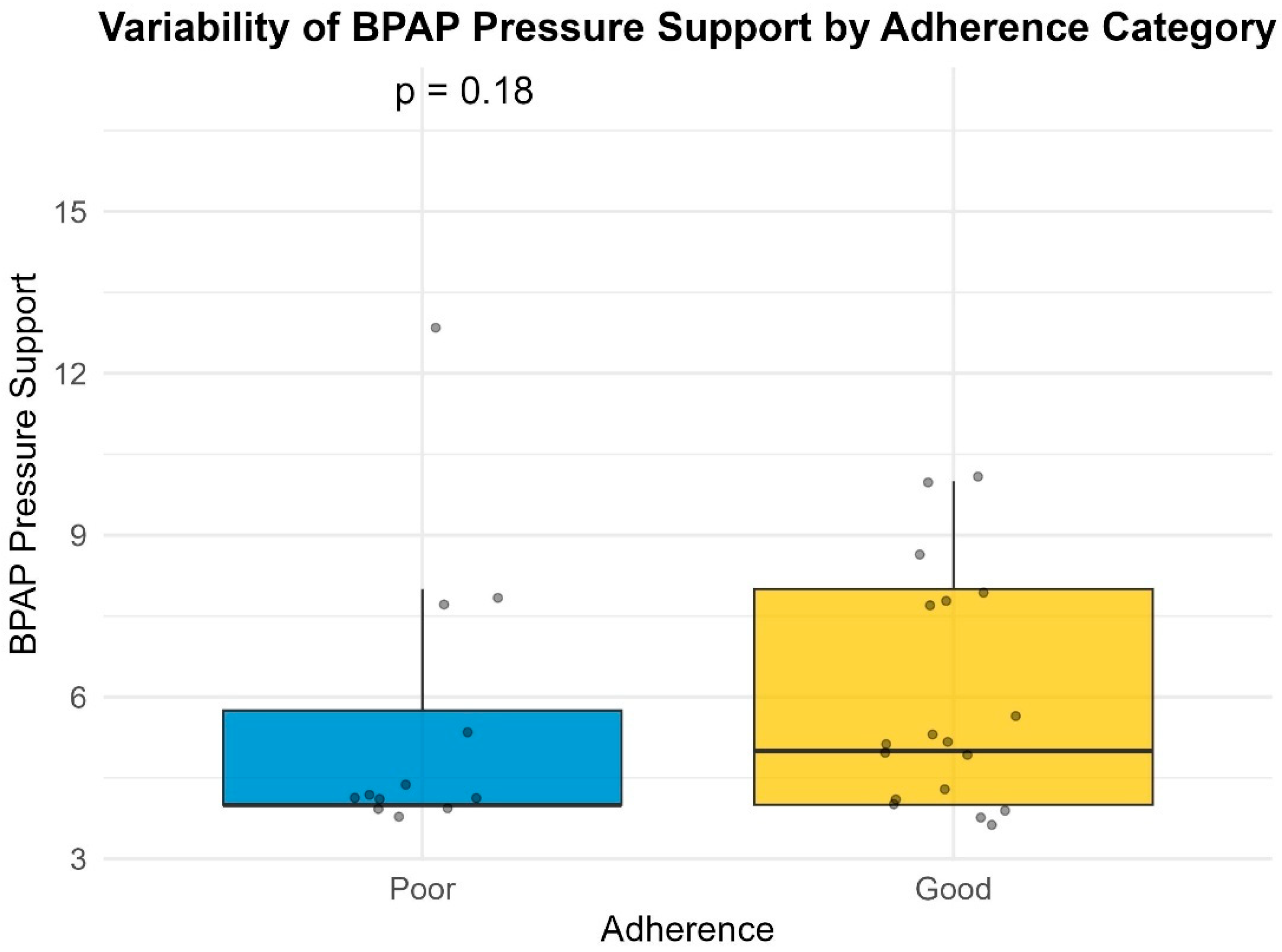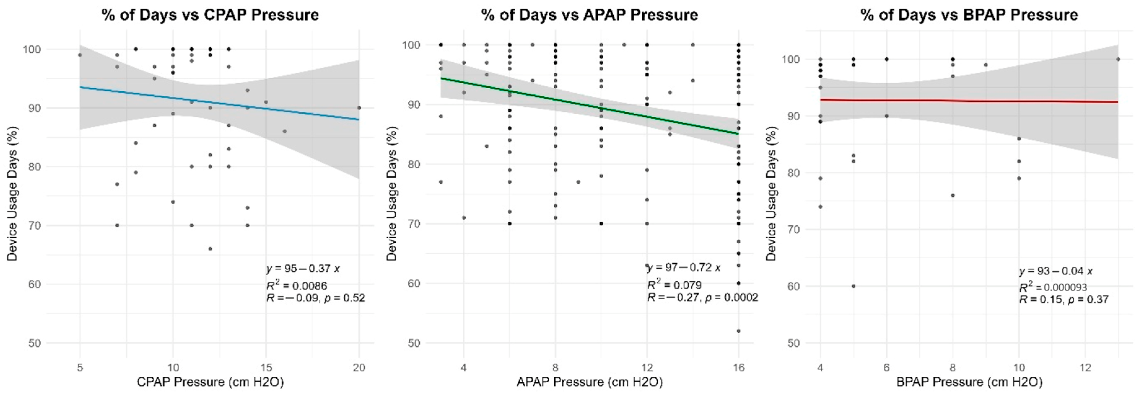 Second, the relatively small sample size limits the statistical power of the study. While the findings provide valuable insights into PAP adherence/compliance patterns, a larger cohort would enhance the generalizability of the conclusions. Additionally, some key variables, such as patient-reported side effects, mask-fit issues, and subjective sleep quality, were not assessed, which could have provided a more comprehensive understanding of adherence challenges. Additionally, data regarding mask leaks were not consistently available in the hospital database. We acknowledge that high-pressure variability can sometimes be an artifact of high air leaks rather than physiological obstruction. However, regardless of the cause (leak vs. respiratory event), large pressure swings represent a disruptive factor for sleep quality and likely contribute to lower compliance.