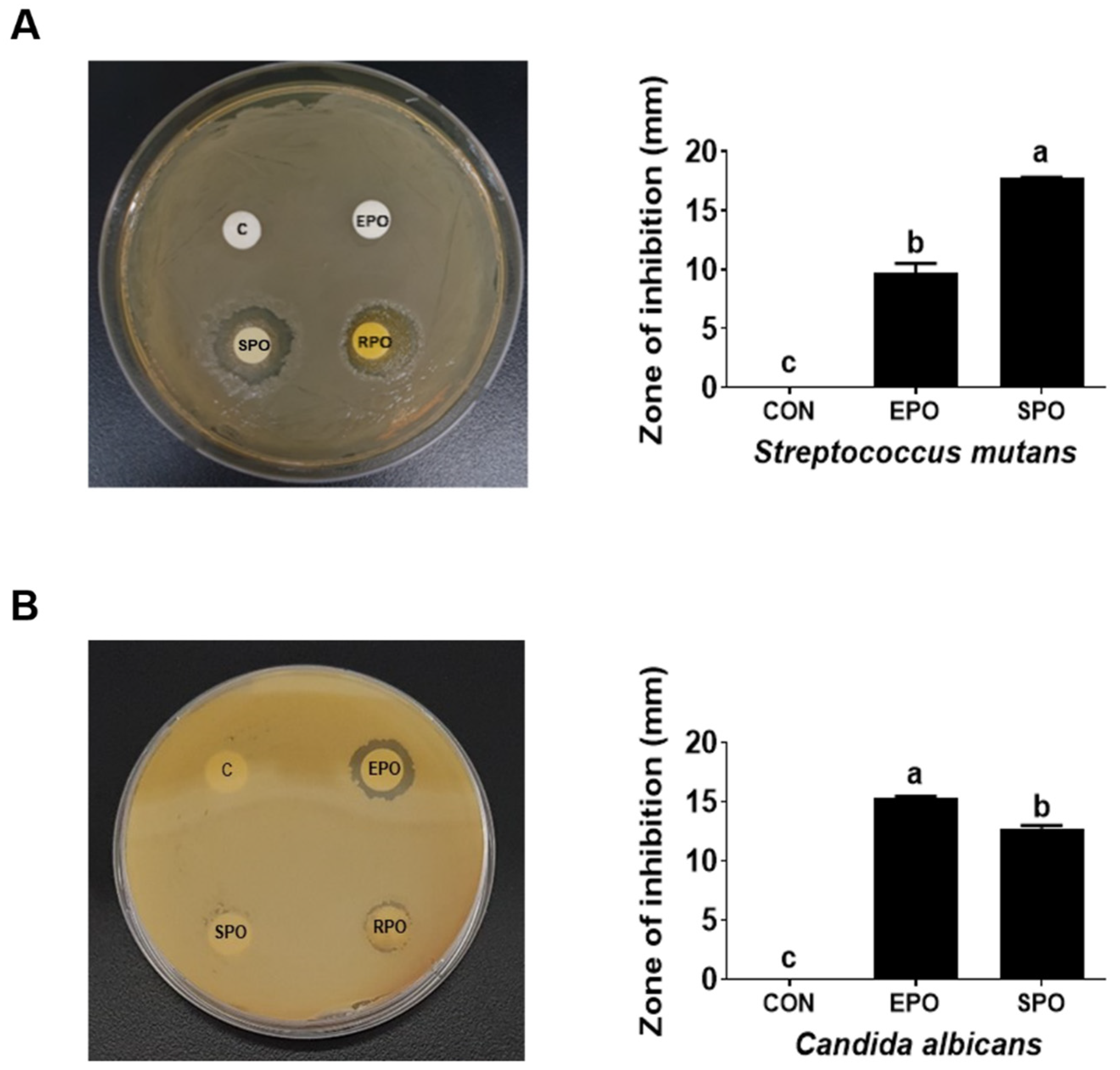 3.1. Comparison of the Antimicrobial Activities of Pinus koraiensis Essential Oil (EPO) and Supercritical CO2 Extract Oil (SPO) Against Streptococcus mutans and Candida albicans