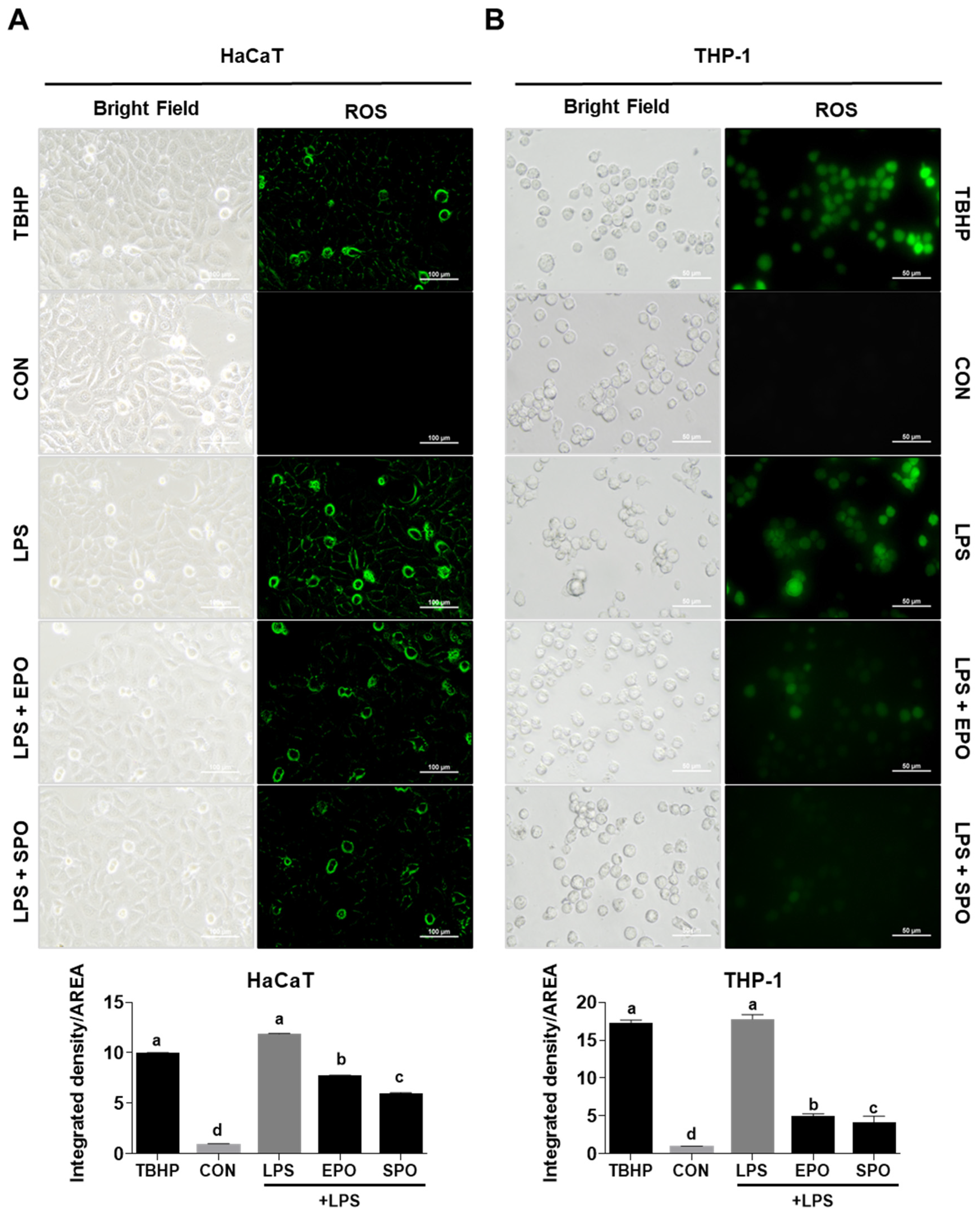 3.2. Comparison of the Antioxidant Activities of EPO and SPO on LPS-Stimulated HaCaT and THP-1 Cells