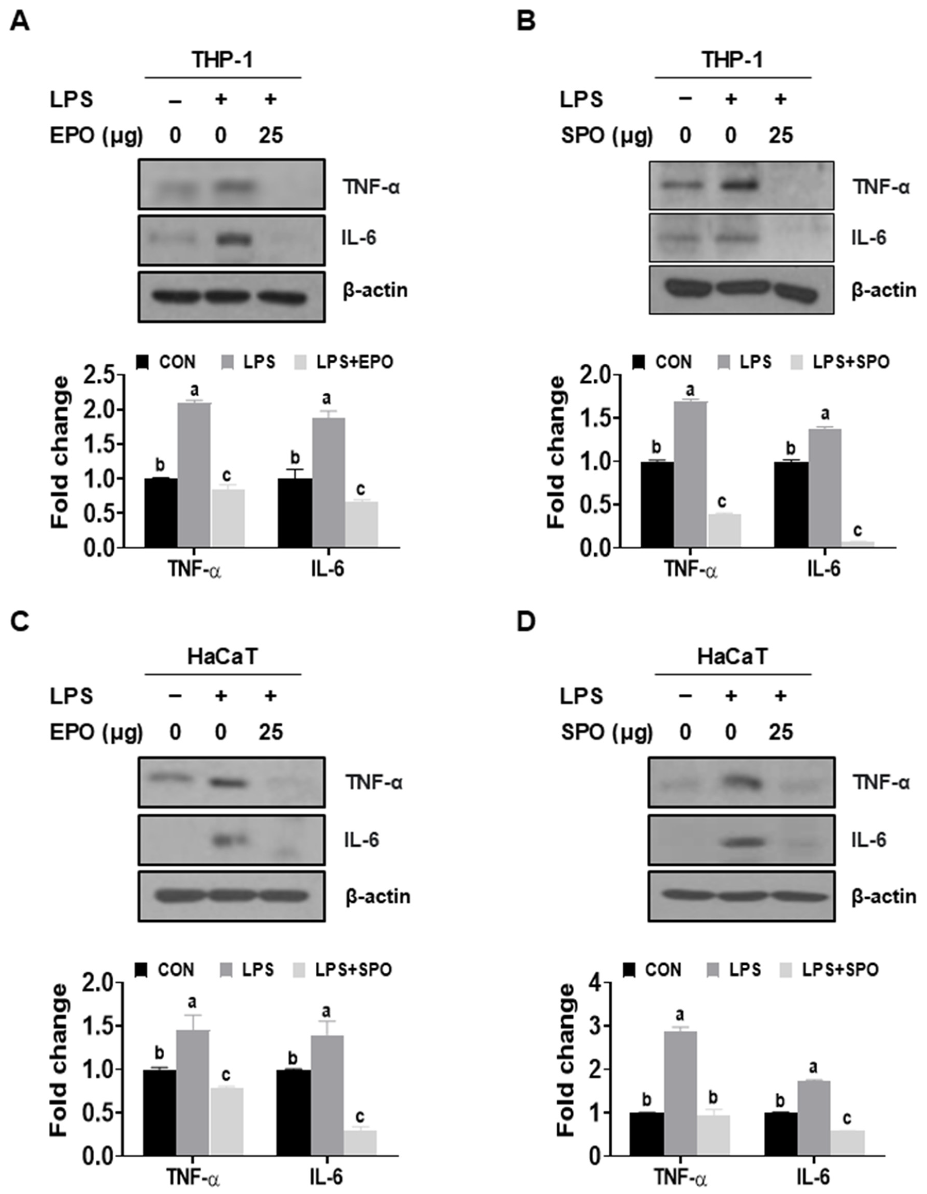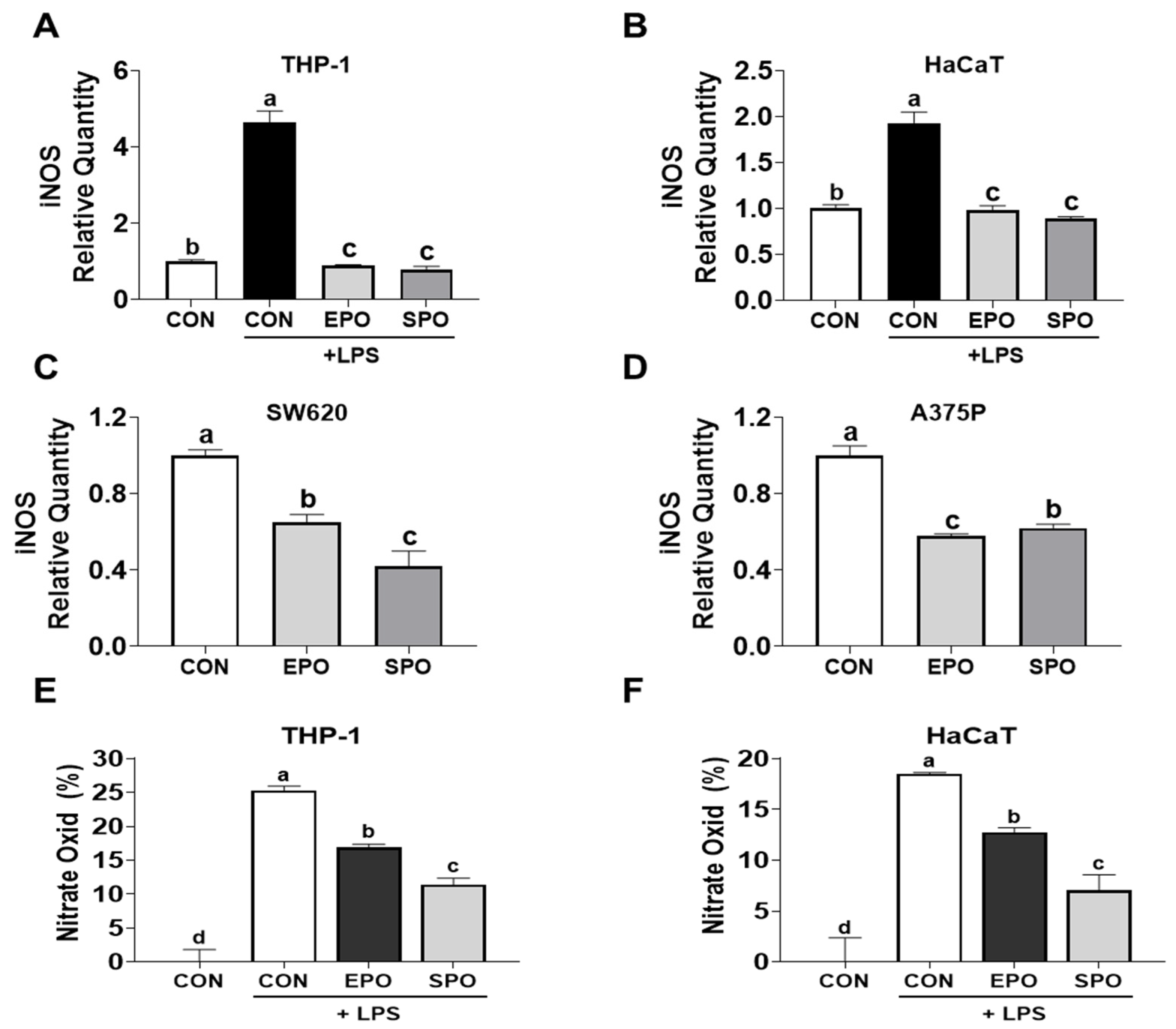 3.3. Comparison of the Anti-Inflammatory Effect of EPO and SPO on LPS-Stimulated HaCaT and THP-1 Cells