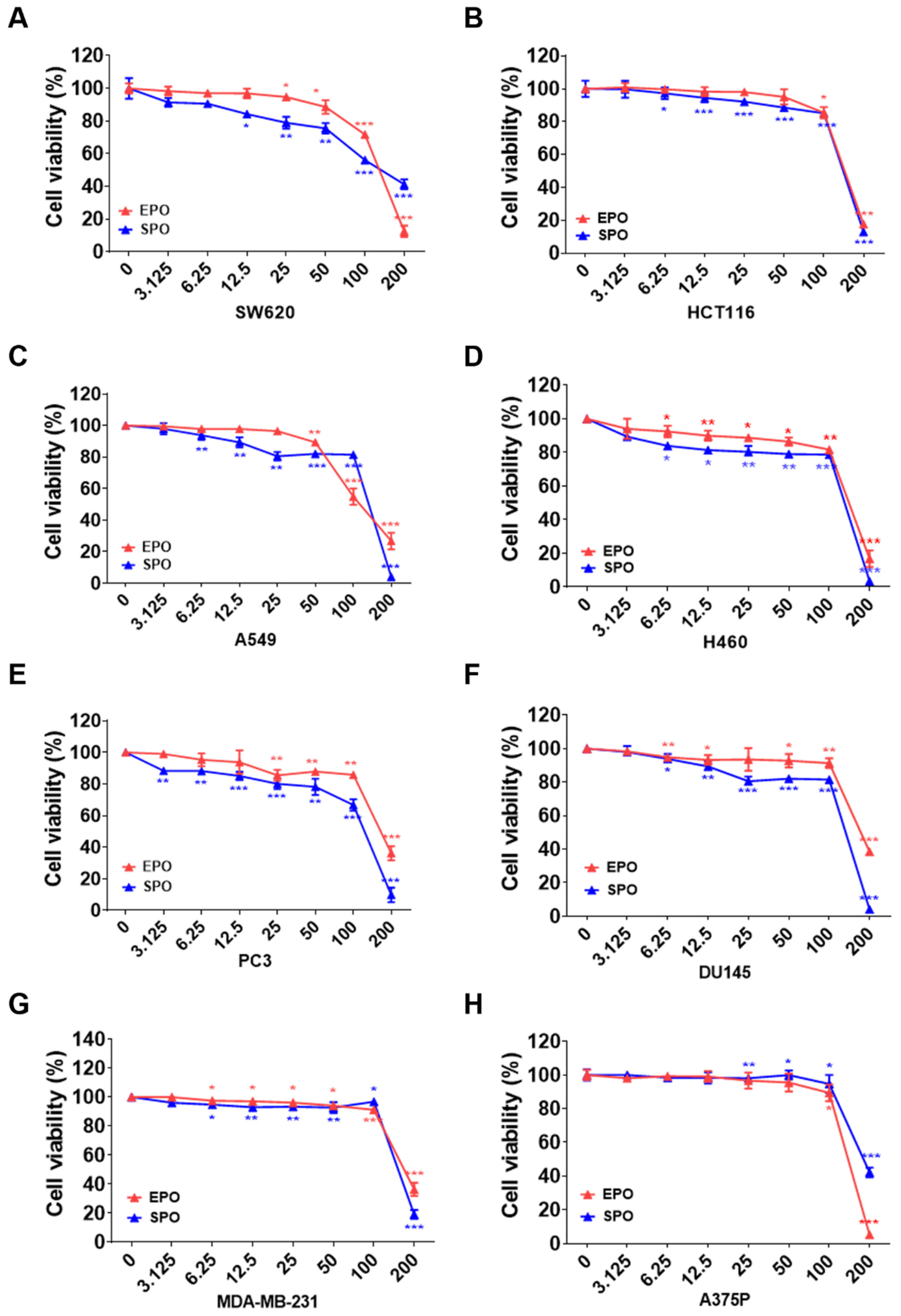 3.4. Comparison of Cancer Cell Growth Inhibitory Properties of EPO and SPO on Various Human Cancer Cell Lines