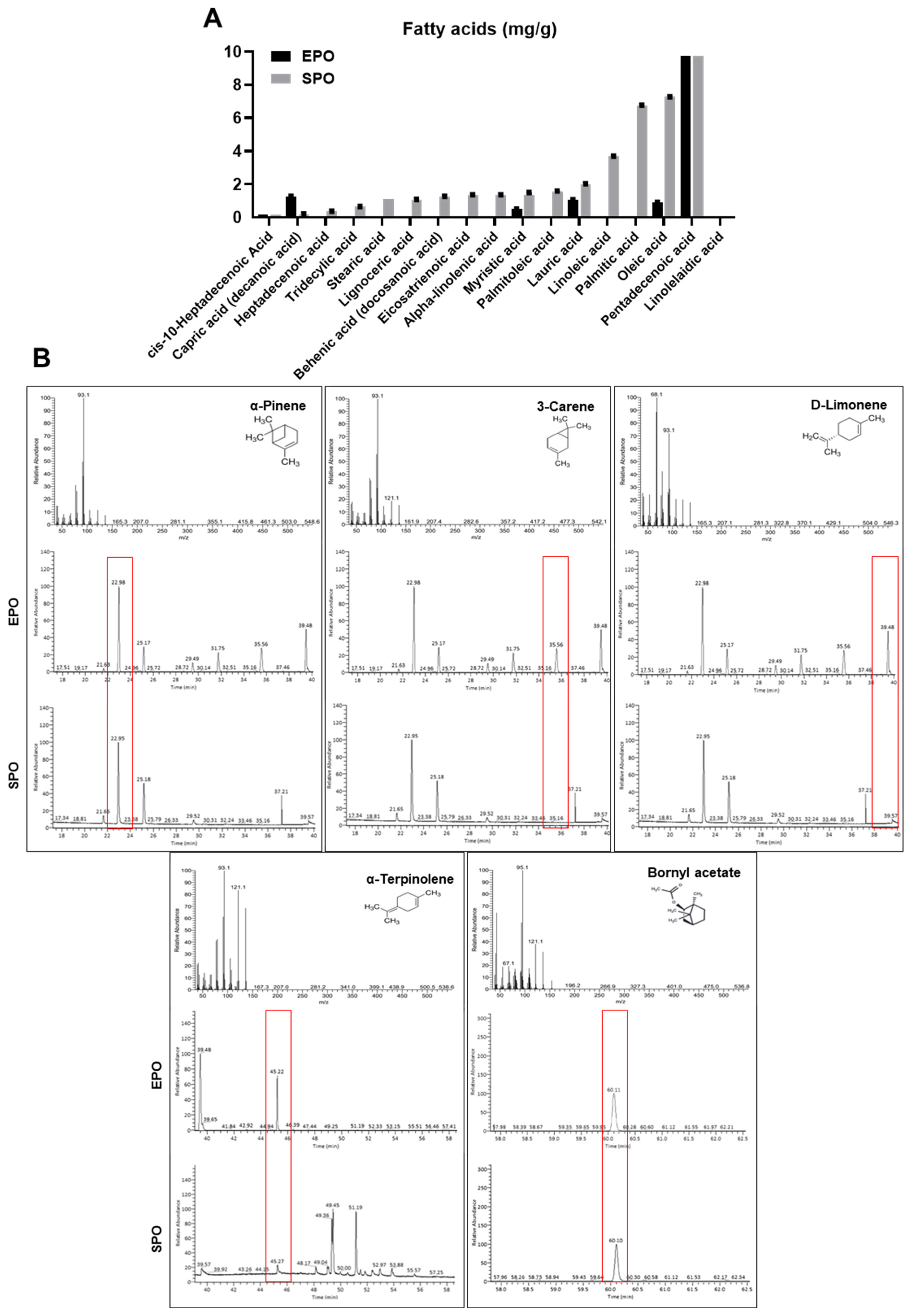 3.5. Comparison of the Fatty Acid Content and Volatile Terpenoids in the EPO and SPO