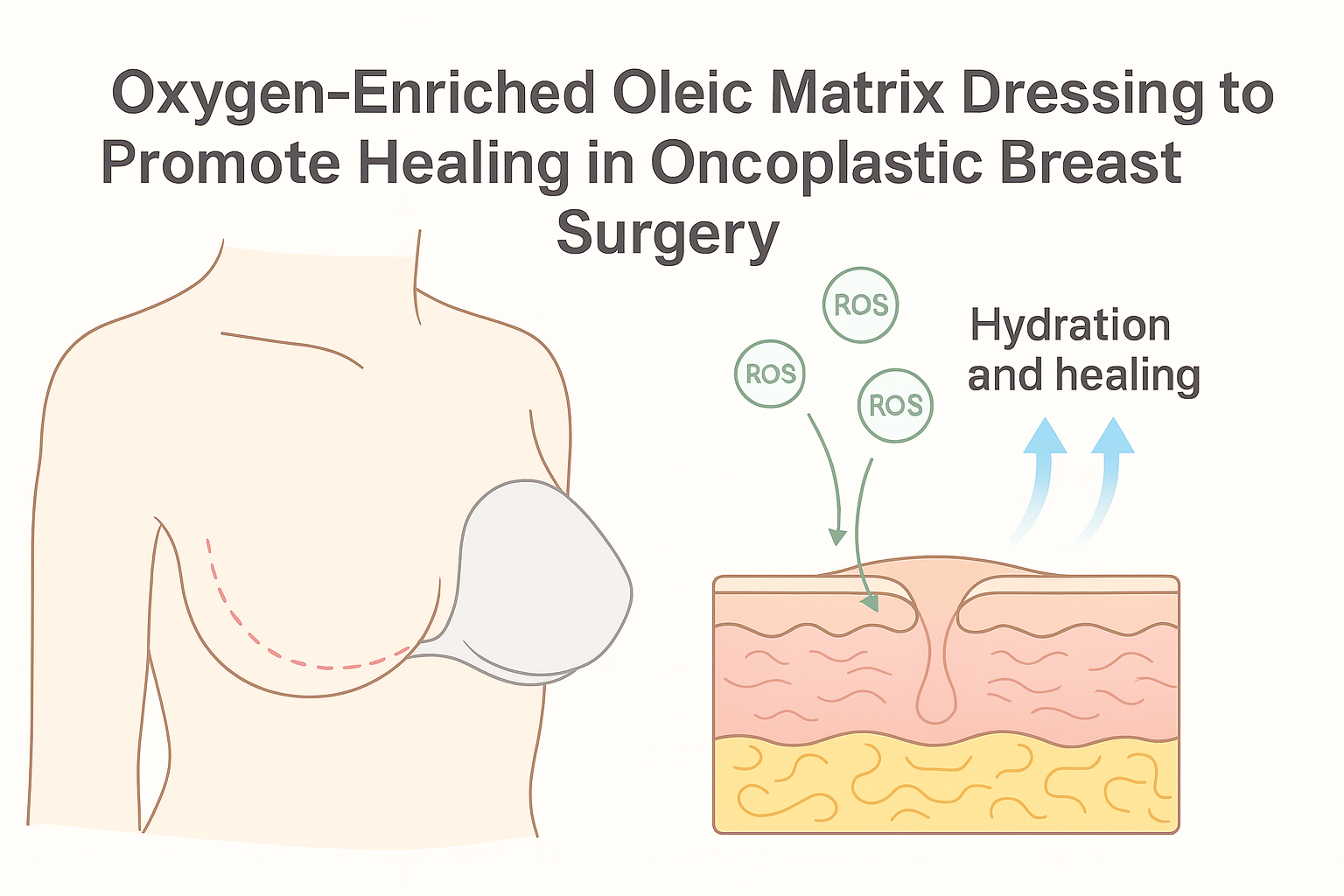 11] can enhance moisture balance and antimicrobial protection, but at a considerably higher cost and with greater complexity of use. In this context, we evaluated a breast-shaped polyurethane and polyester dressing impregnated with an oxygen-enriched oleic matrix, designed to provide a controlled, low-level release of reactive oxygen species (ROS) that act as physiological mediators of wound healing, angiogenesis, and fibroblast activation. This controlled oxidative stimulus promotes a balanced microenvironment that supports tissue repair without inducing harmful oxidative stress. The oleic component contributes additional moisturizing and barrier-restoring properties, maintaining an optimal local environment for epithelialization.