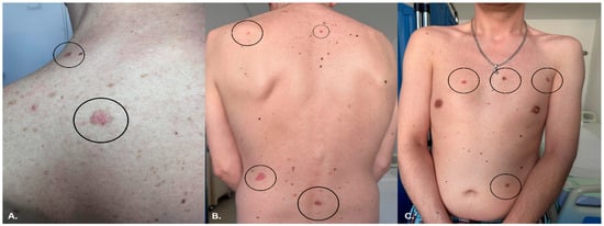 Figure 2. Clinical images showing multiple erythematous-violaceous papules and plaques located on the (A) shoulders, (B) back, and (C) chest. The black circles highlight representative lesions as observed during clinical examination.