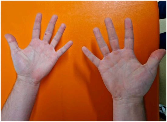 Figure 8. Clinical image of the patient’s palms showing smooth, uninterrupted epidermal surface with no evidence of palmar pits. The absence of these hallmark features supports exclusion of Nevoid Basal Cell Carcinoma Syndrome (Gorlin Syndrome) as part of the differential diagnosis.