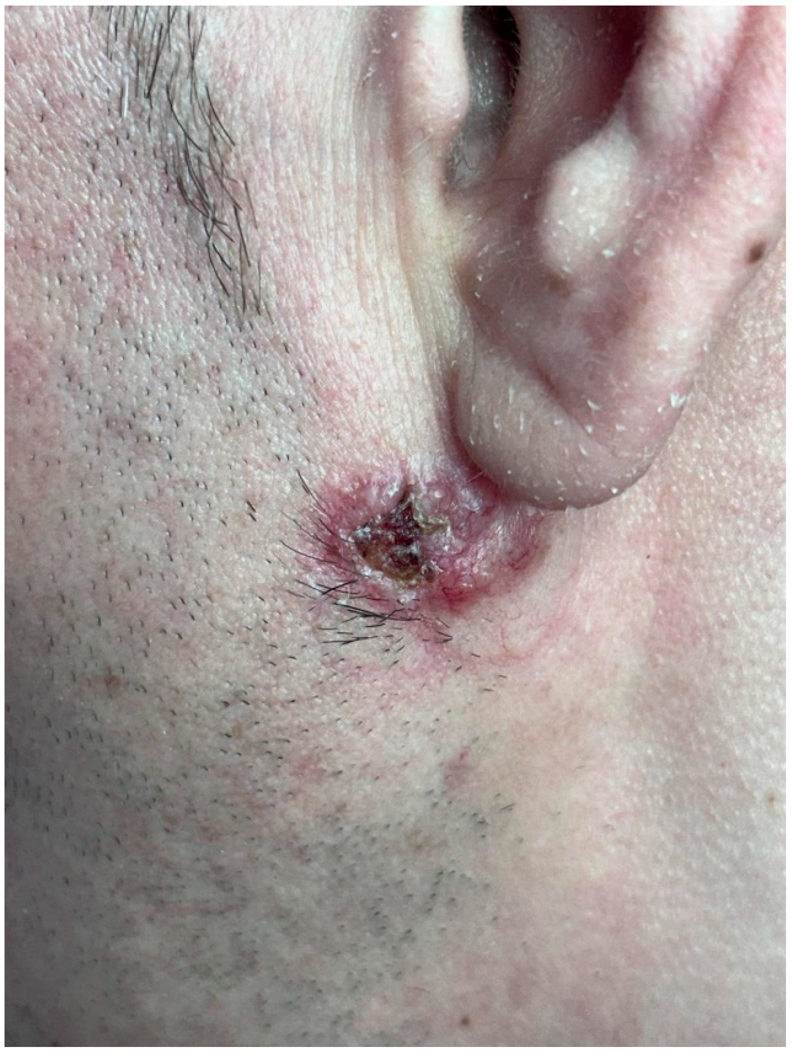 Figure 3. Ulcerated erythemato-violaceous plaque located below the left ear.