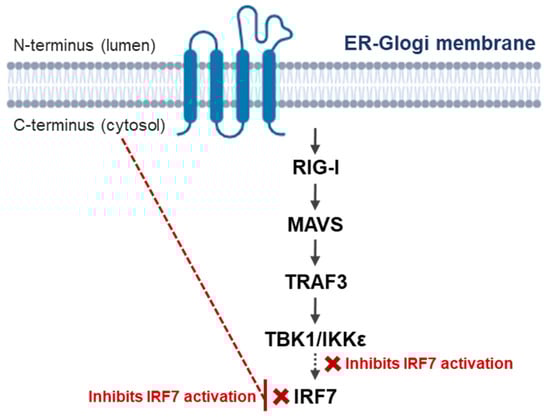 PEDV infection has been reported to interfere with this signaling cascade at multiple levels, and PEDV M protein appears to act downstream of pattern recognition receptors (PRRs) by selectively impairing IRF7 activation rather than receptor engagement [45,49]. Importantly, these observations are largely derived from cell-based expression or infection models, and the apparent preference for IRF7 targeting may reflect the specific experimental systems used rather than a universally dominant mechanism in all PEDV-infected epithelial contexts.