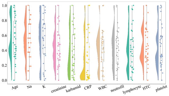 Figure 1. Raincloud plot illustrating the distribution of key clinical variables in the study population. The plot combines violin plots, which show the distribution shape, with boxplots indicating median and interquartile ranges, along with individual data points represented as scatter points. Variables include age, baseline modified Rankin scale (mRS), WFNS grade, serum sodium (Na), potassium (K), C-reactive protein (CRP), white blood cell count (WBC), neutrophil count, lymphocyte count, hematocrit count (HTC), and platelet count. The distributions reveal significant deviations from normality for several critical clinical parameters, particularly those related to inflammatory markers and neurological status.