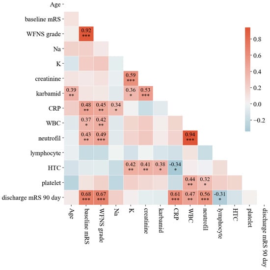 Figure 3. Spearman’s rank correlation coefficients among key clinical parameters assessed in the study. The matrix highlights the strength and direction of associations between variables. Notably, strong correlations are observed between neurological severity indicators (WFNS grade and baseline mRS) and inflammatory markers (CRP, WBC, and neutrophils), suggesting that elevated inflammatory responses may contribute to worse neurological outcomes and an increased risk of symptomatic vasospasm. The color gradient indicates positive and negative correlations, with darker shades representing stronger associations. Stars are used to indicate statistical significance at three commonly utilized levels. A p-value less than 0.05 is marked with (∗), less than 0.01 with (∗∗), and less than 0.001 with (∗∗∗).