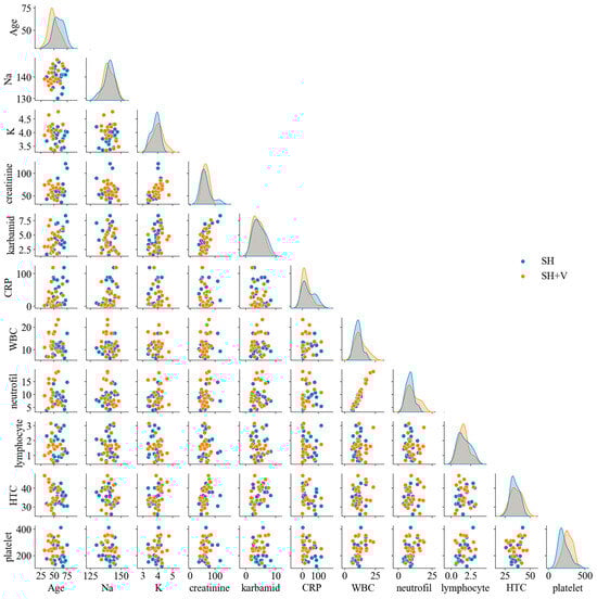 Additionally, a pair-plot analysis (Figure 4) was performed to explore potential nonlinear patterns and interactions between variables. The pair-plot distinguishes between the two patient groups (SH vs. SH + V) using color coding, allowing for visual assessment of possible group-based differences. Clinically, these findings emphasize the importance of considering multiple factors when assessing patient outcomes. The lack of strong, obvious correlations between variables may indicate the complexity of the patient profiles and the multifactorial nature of the disease or condition under study.