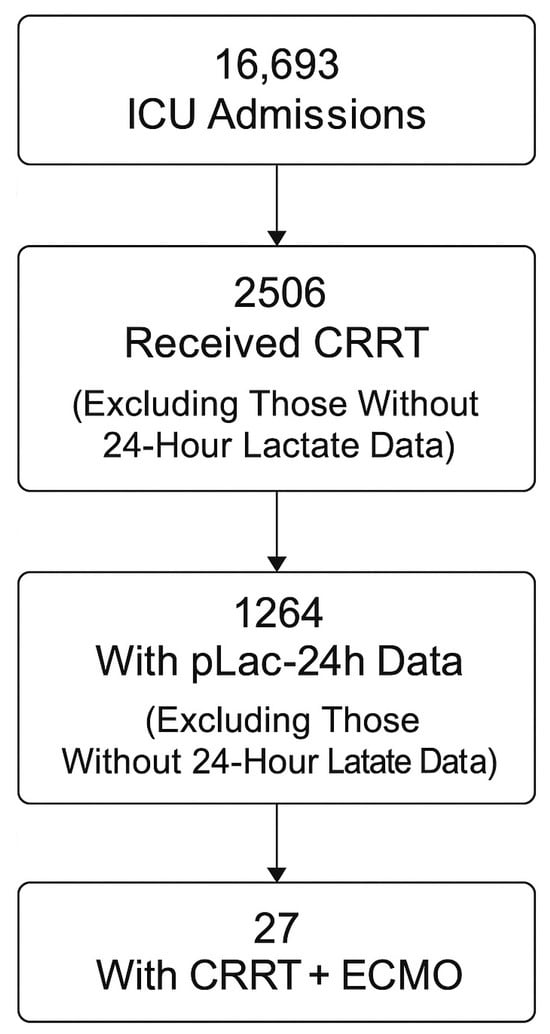 Among 16,693 unique ICU admissions during the study period, 2506 adult patients (≥20 years) who received continuous renal replacement therapy (CRRT) for severe sepsis or septic shock were screened. CRRT was defined as blood purification therapy documented by the “renal replacement therapy” variable in the dataset (indicator = 1). CRRT was initiated for sepsis-associated acute kidney injury or for metabolic control according to predefined dataset variable definitions. Patients were excluded if they had missing mortality data, were readmitted during the same hospitalization, or lacked lactate measurements within 24 h of ICU admission. After exclusions, 1264 patients (50.4%) with available 24 h peak lactate data were included in the final analysis. Lactate measurements within the first 24 h were unavailable in some patients due to delayed ICU admission, early mortality before laboratory sampling, transfer from other hospitals without complete laboratory records, or clinical prioritization of urgent organ support before routine metabolic assessment. Lactate measurement was part of routine sepsis evaluation rather than being restricted to the most critically ill patients; therefore, missing data were primarily attributable to logistical and timing-related factors rather than selective testing based on illness severity.