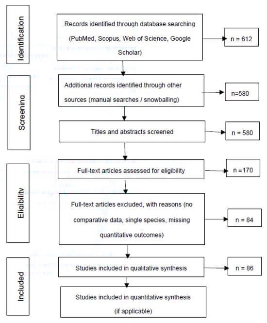 Exclusion criteria were: (1) reviews, editorials, commentaries, or conference abstracts; (2) studies limited to a single species without comparative relevance; (3) studies lacking original data or presenting insufficient methodological detail.