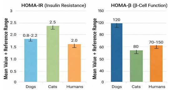 Systematic integrative analyses support the use of HOMA indices for assessing β-cell function in both species, demonstrating distinct reference intervals and a strong correlation between HOMA-insulin resistance (HOMA-IR) and disease severity [29,42]. Studies validating HOMA-IR in cats confirm its predictive value for hyperinsulinemia, impaired glucose tolerance, and increased risk of T2DM [29,50]. Figure 3 illustrates interspecies differences in mean values and reference ranges for HOMA-IR and HOMA-β (β-cell function) in dogs, cats, and humans [29,31,42].