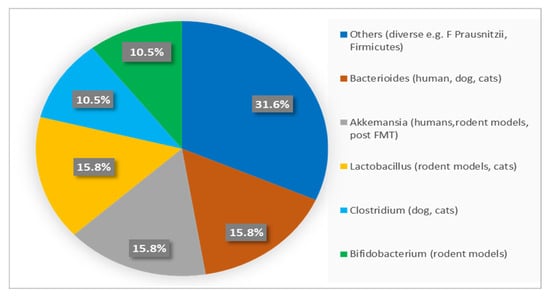 Although microbial taxa differ markedly among humans, dogs, cats, and rodents, key functional pathways—including SCFA synthesis, bile acid signaling, and immune modulation—are evolutionarily conserved. This functional convergence underpins the translational value of canine and feline microbiome studies for understanding metabolic regulation and inflammatory mechanisms relevant to human DM [43,54,55]. Accordingly, Figure 4 presents a semi-quantitative overview of dominant bacterial genera reported across species, facilitating interspecies comparison while minimizing bias related to methodological heterogeneity [14,48,55].