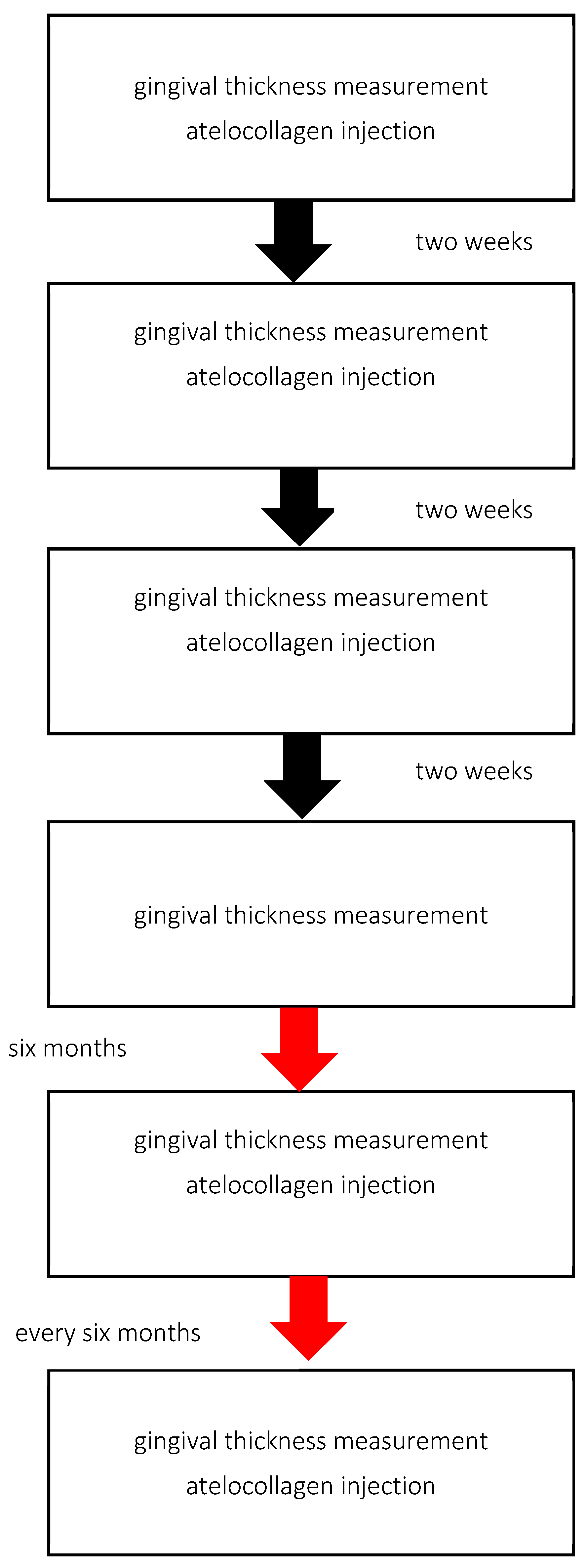 - Klewin-Steinböck, S.; Wyganowska, M. Reduction in Gingival Bleeding after Atelocollagen Injection in Patients with Hashimoto’s Disease-A Pilot Study. Int. J. Environ. Res. Public. Health 2023, 20, 2954. [Google Scholar] [CrossRef]