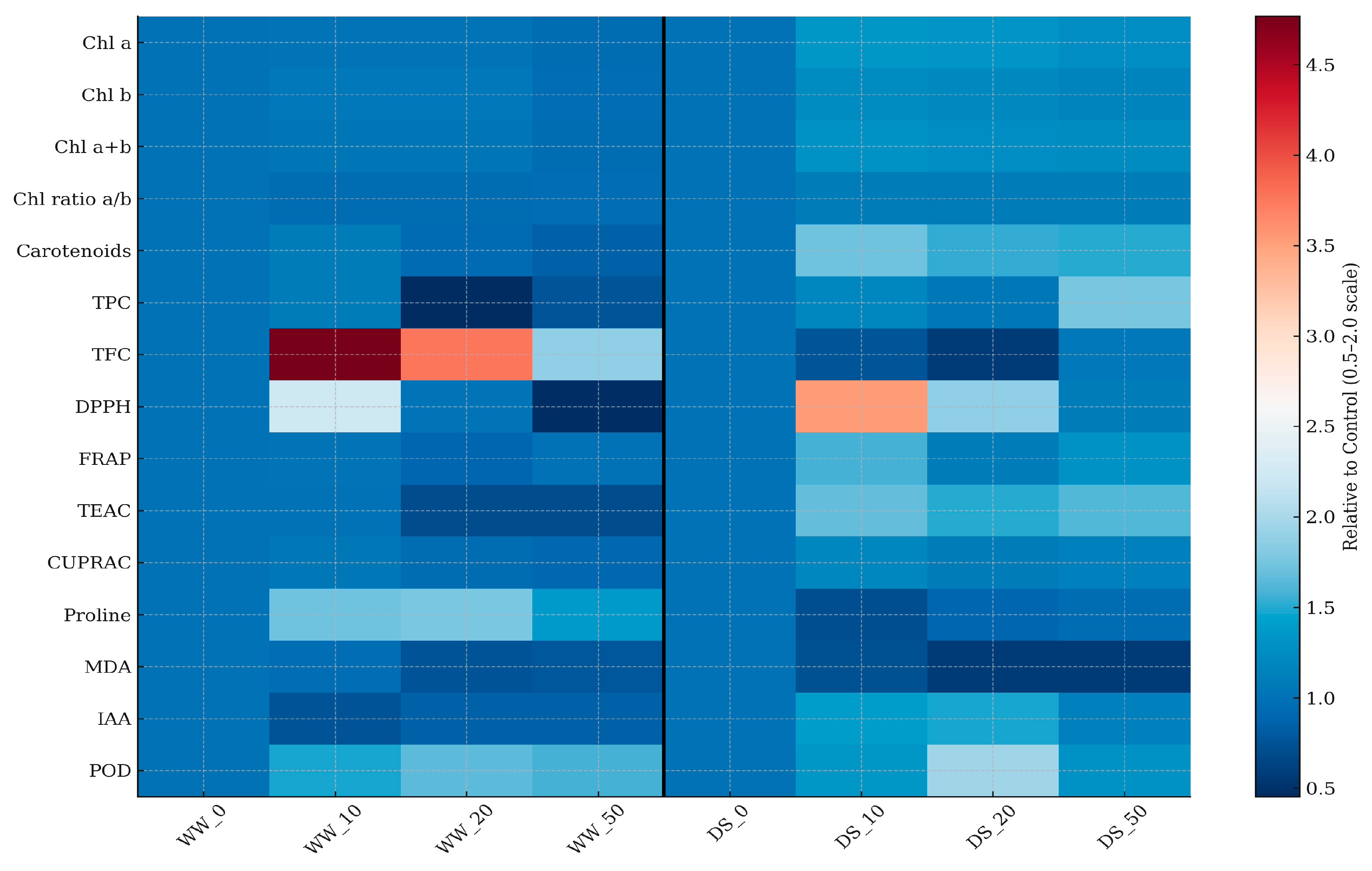 3.3. Biochemical Parameters of Broccoli Under Drought and Nanoparticles Treatments