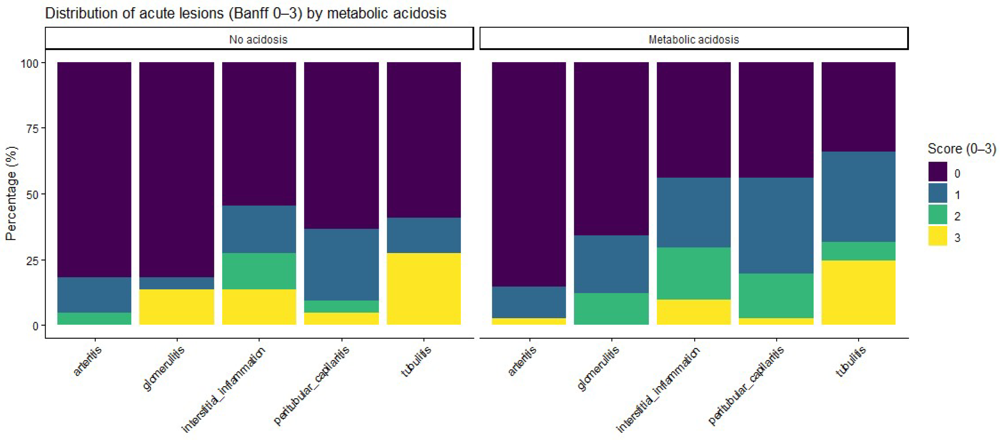 Figure 1. Patients with metabolic acidosis had numerically higher severity scores for inflammatory lesions, including glomerulitis, peritubular capillaritis, interstitial inflammation, and tubulitis, than patients without acidosis, whereas no relevant differences were observed for arteritis. When analyzed as ordinal severity scores, median [IQR] Banff grades were consistently higher among acidotic patients; however, Wilcoxon rank-sum testing did not show statistically significant differences between groups (