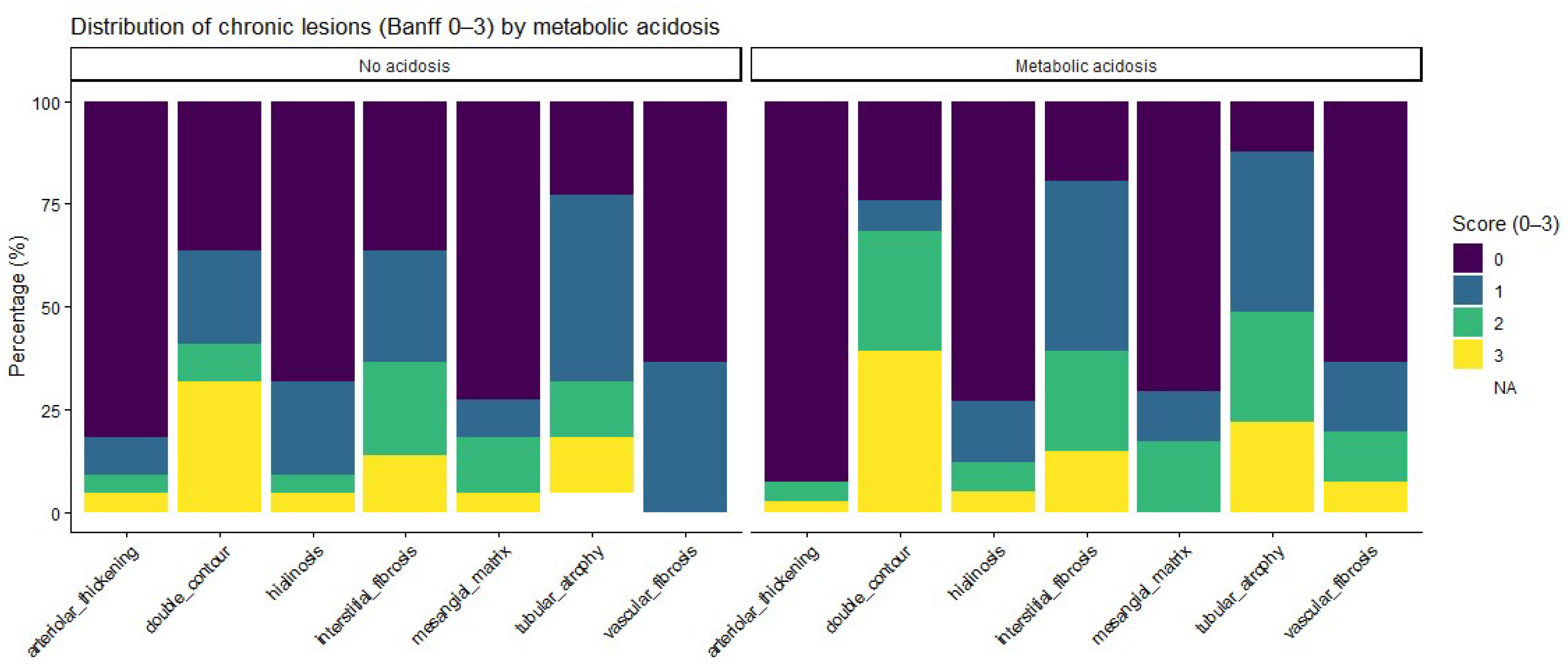 Regarding chronic histological lesions, patients with metabolic acidosis had numerically higher scores for interstitial fibrosis and tubular atrophy, as well as for other chronic changes. Detailed distributions are provided in