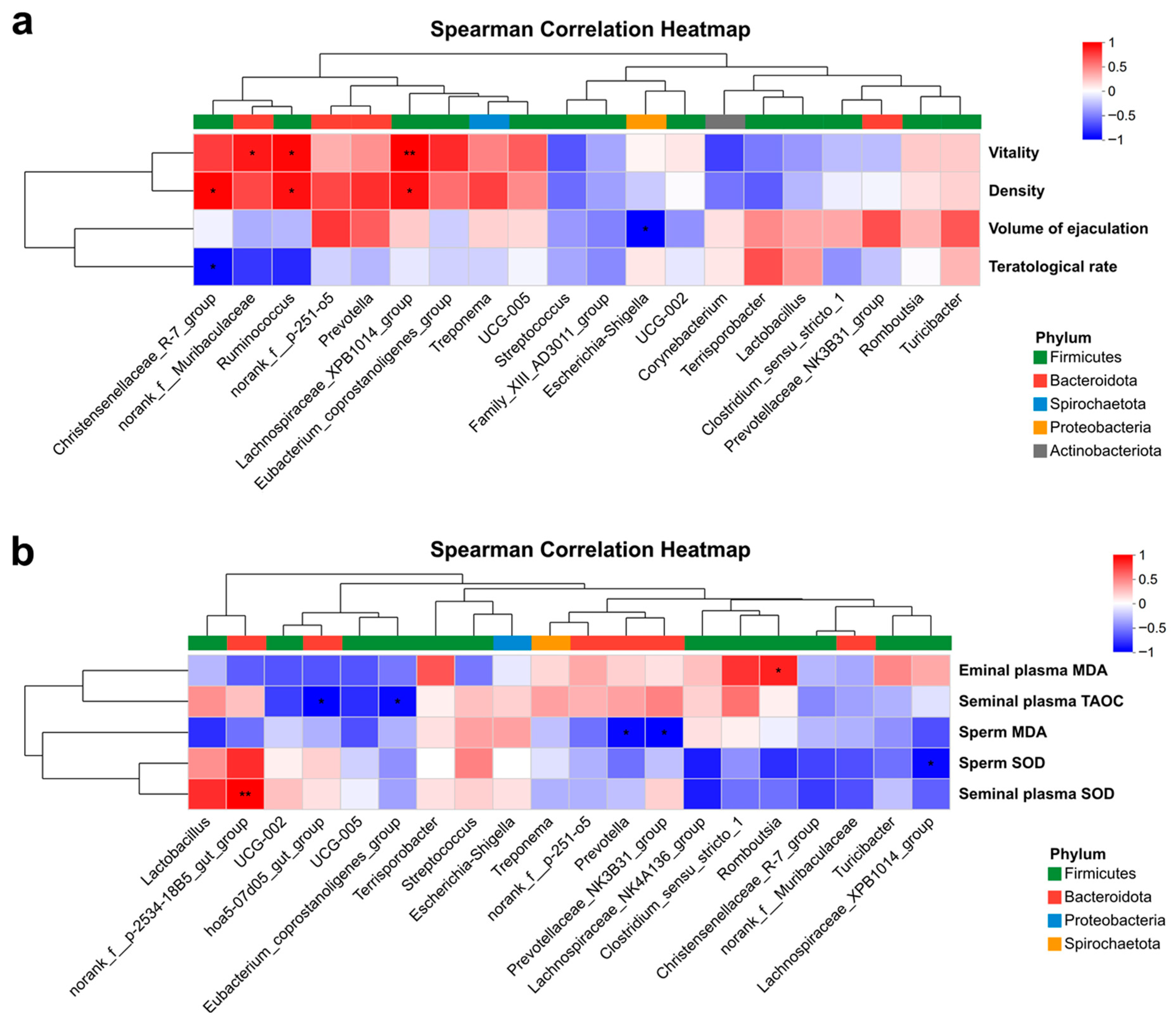 - Ding, N.; Zhang, X.; Zhang, X.D.; Jing, J.; Liu, S.S.; Mu, Y.P.; Peng, L.L.; Yan, Y.J.; Xiao, G.M.; Bi, X.Y.; et al. Impairment of spermatogenesis and sperm motility by the high-fat diet-induced dysbiosis of gut microbes. Gut 2020, 69, 1608–1619. [Google Scholar] [CrossRef]