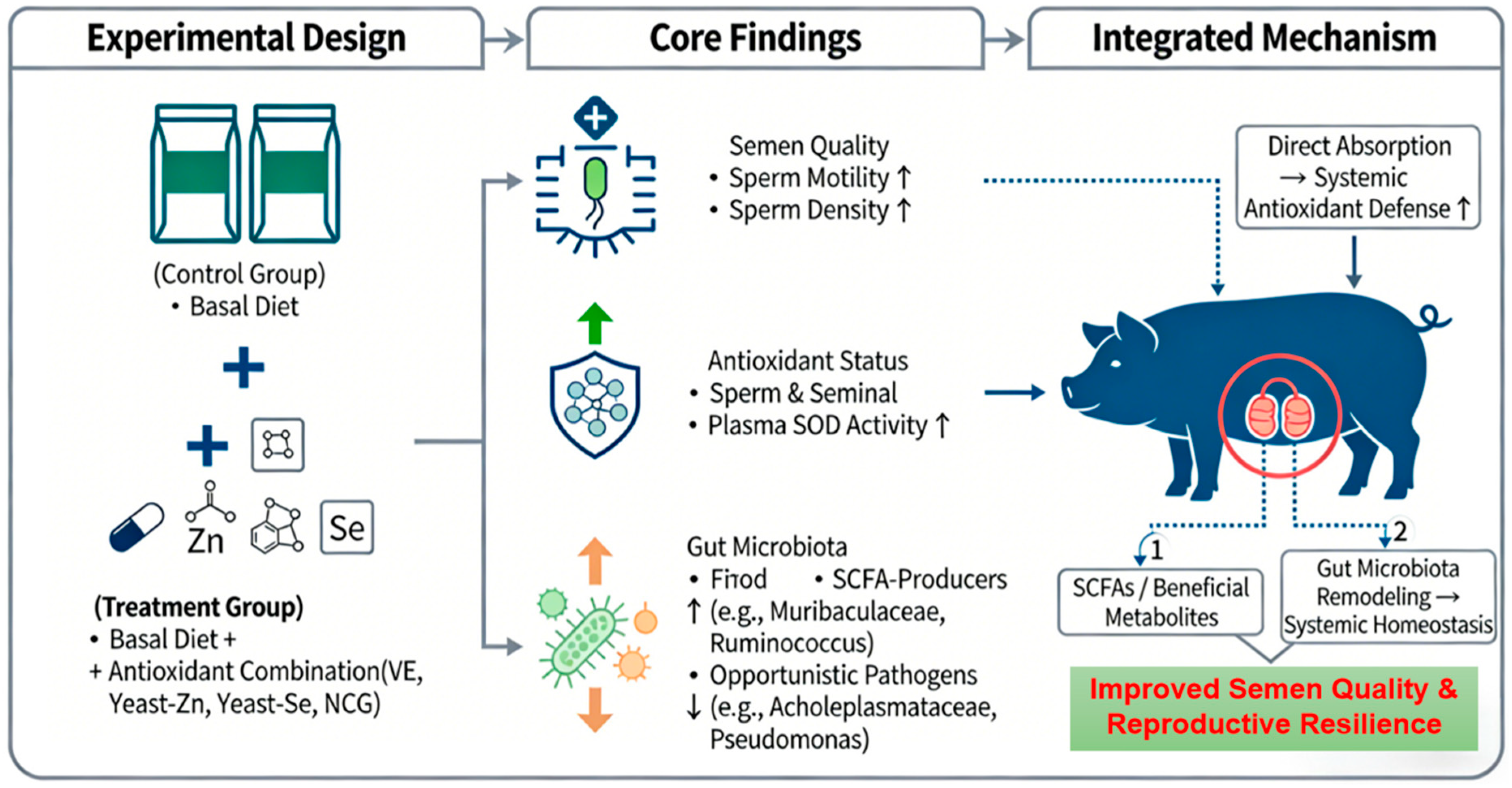 APA StyleWang, L., Zhang, C., Li, S., Mei, X., Kuang, X., Wang, Q., & Yang, H. (2026). Regulatory Effects of an Antioxidant Combination on Seminal Quality and Gut Microbiota in Ningxiang Boars Under Heat Stress. Life, 16(1), 99. https://doi.org/10.3390/life16010099