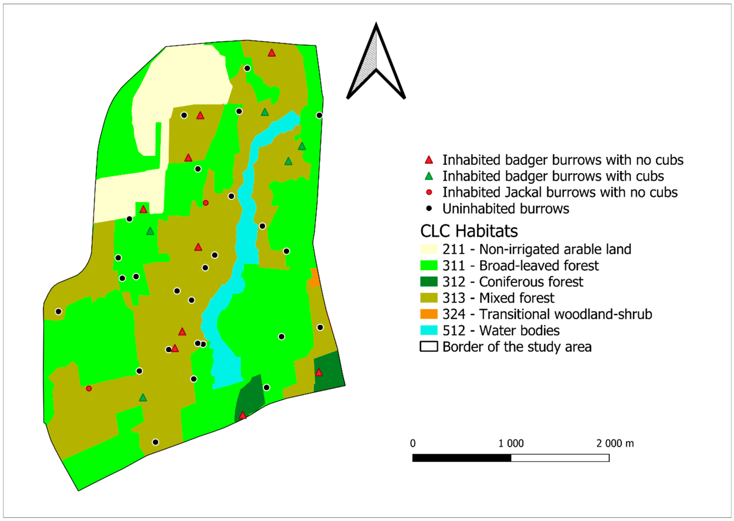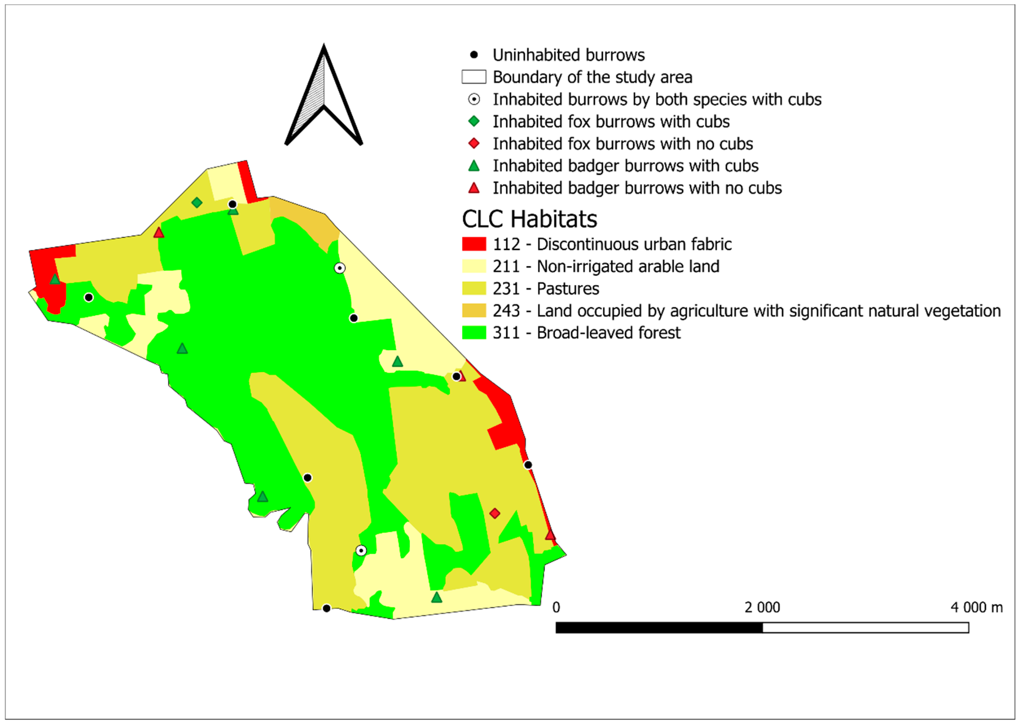 For statistical analysis, the inhabited burrows were divided into two groups, which are the burrows with cubs and the burrows without cubs. Using the Mann–Whitney U-test, the size of each CLC category found in the surrounding of burrows with cubs was compared to the categories found in the surrounding of burrows without cubs and random points. For statistical analysis, we used Microsoft Excel and the GraphPad Instat 3 statistical program.