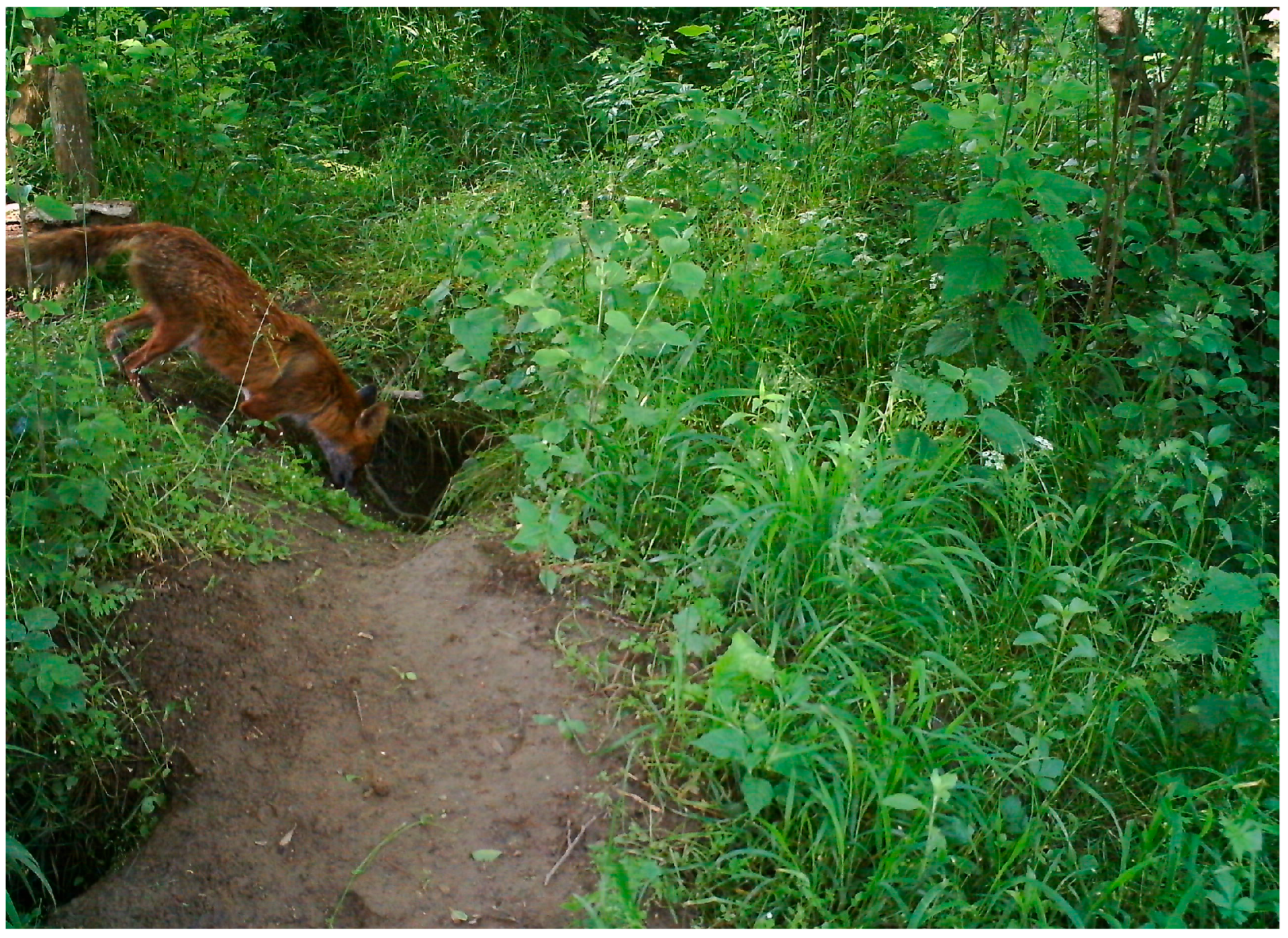 16. Meia, J.S.; Weber, J.M. Characteristics and distribution of breeding dens of the red fox (Vulpes vulpes) in a mountainous habitat. Mamm. Biol. 1992, 57, 137–143. [Google Scholar]