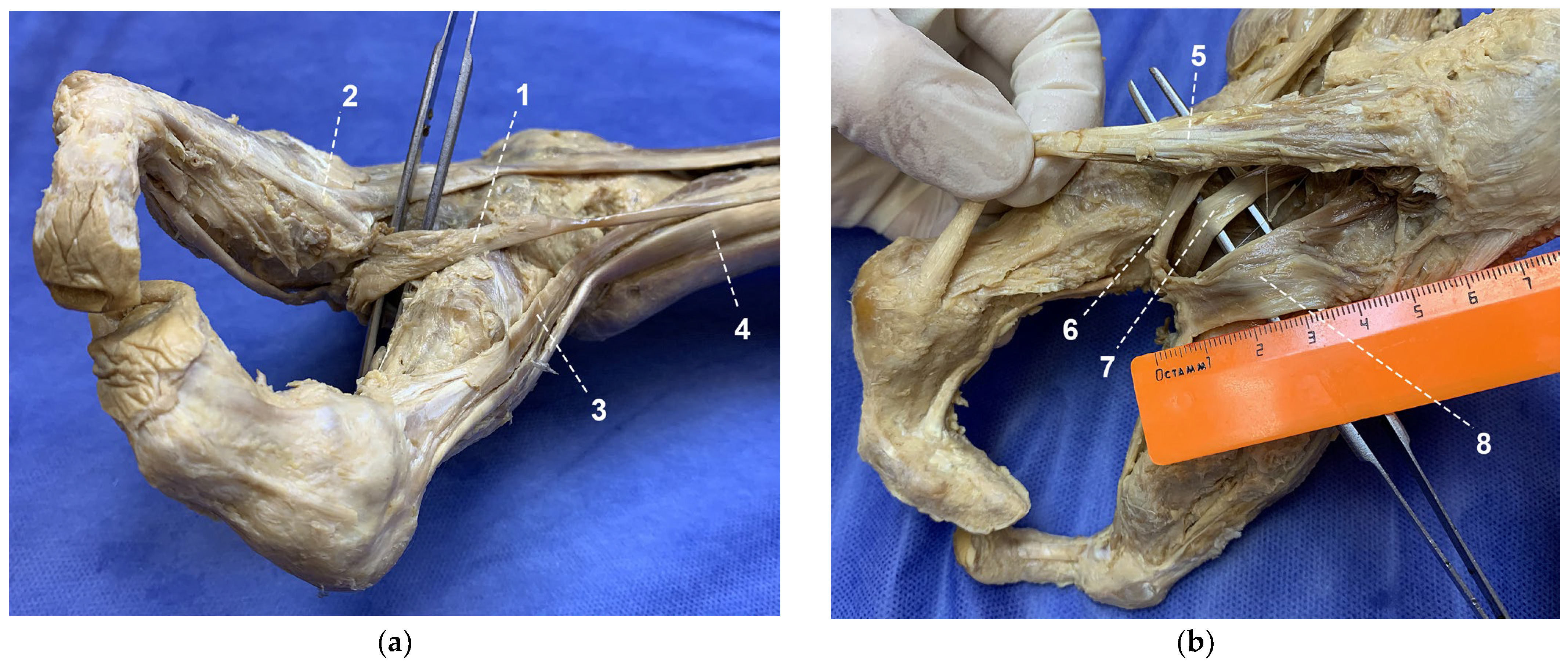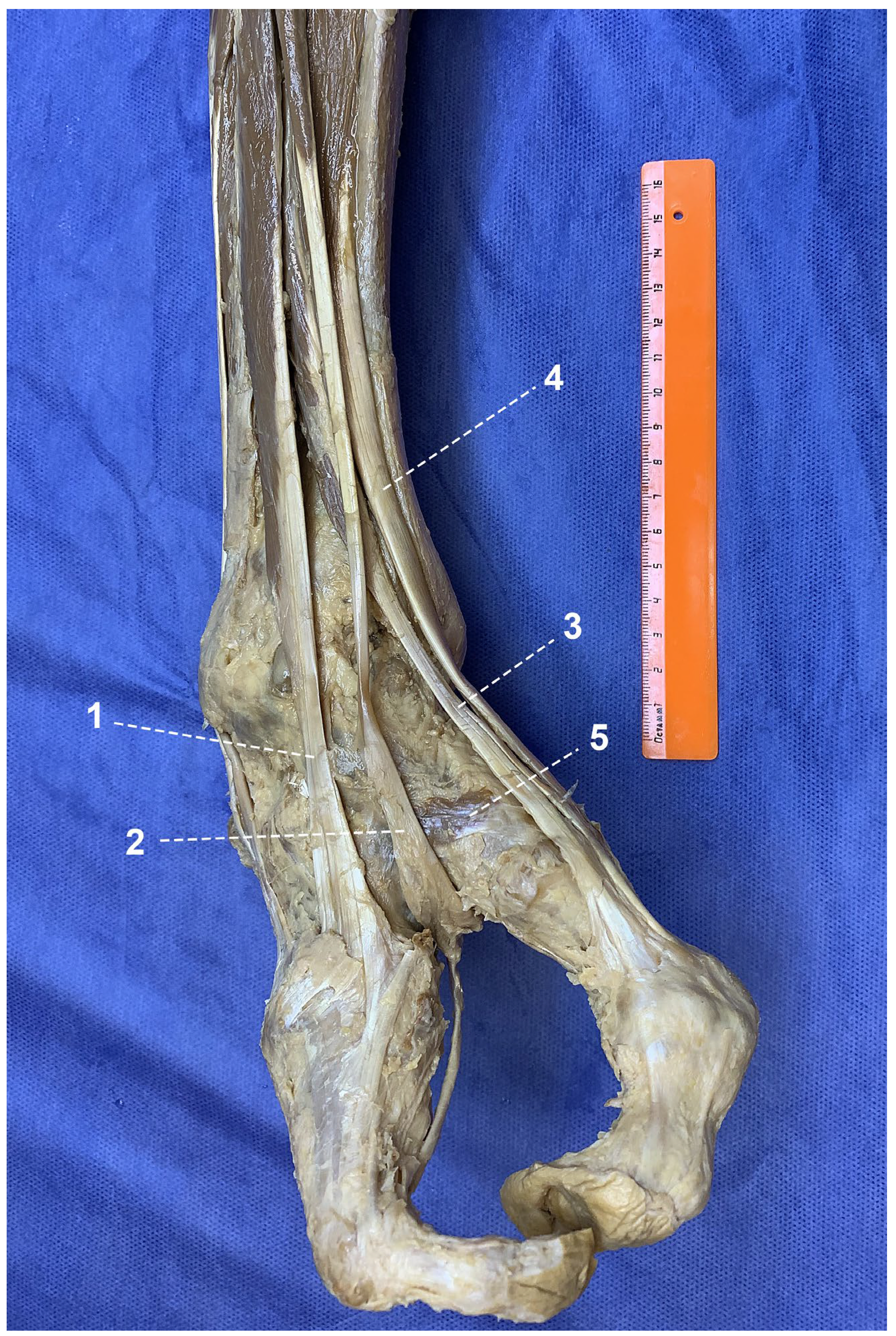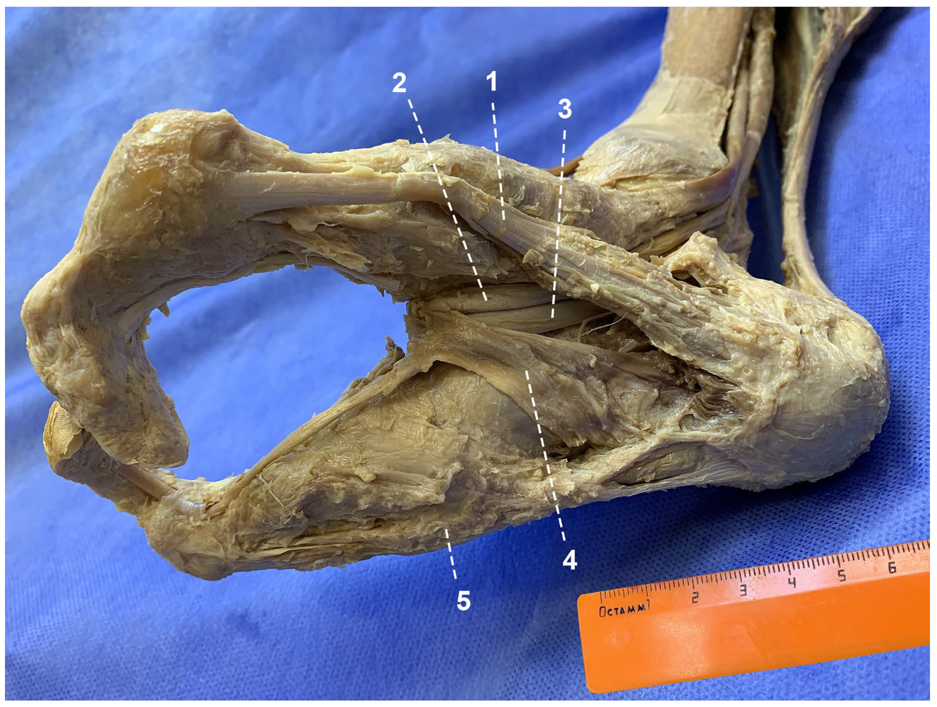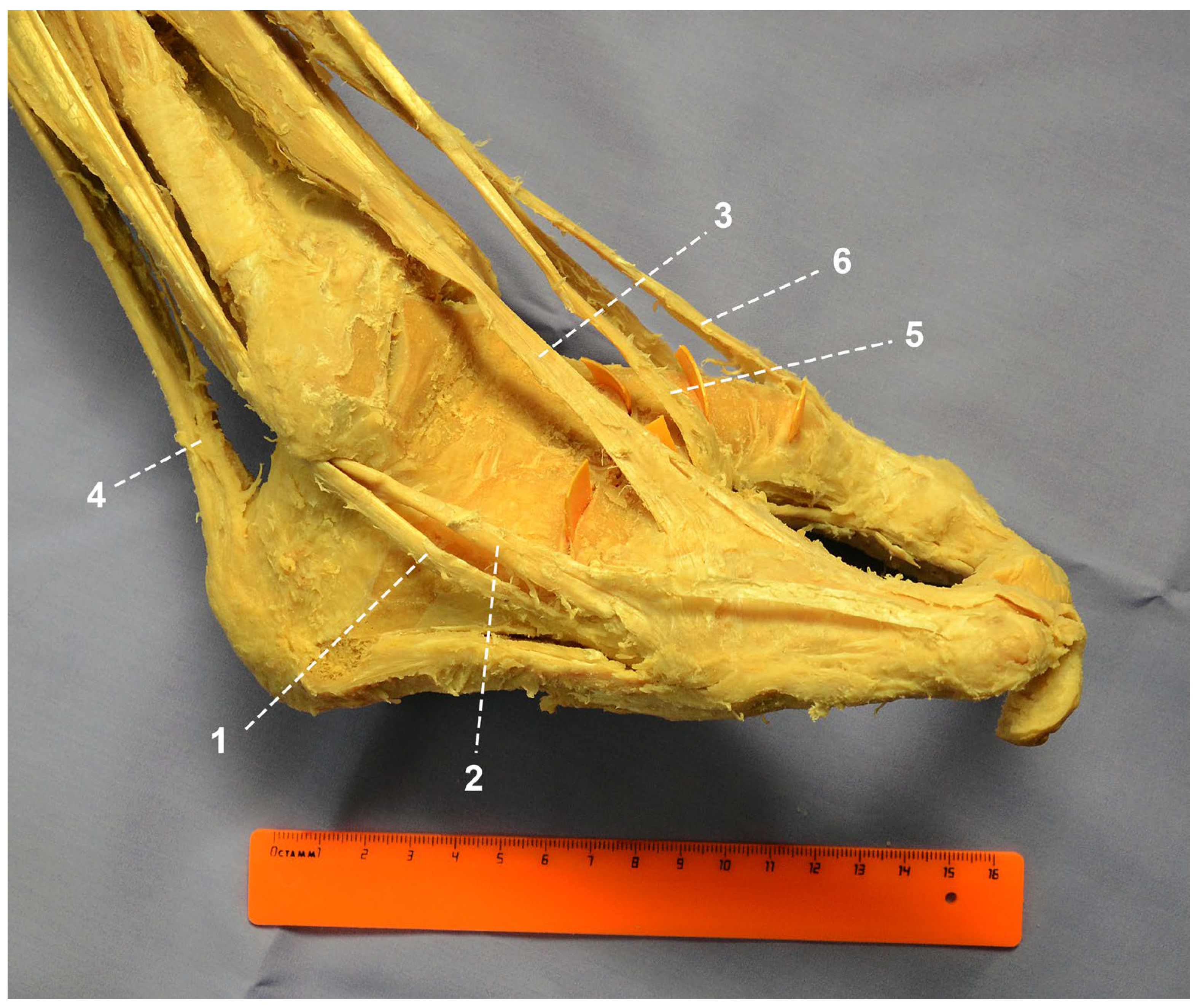 An anatomical study was performed on the body of a 64-year-old male with congenital splitting of both hands and both feet. Body length was 157 cm, weight 49 kg, mesomorphic constitution (body length-to-trunk length ratio index—31.2). The material had been preliminarily fixed in a 7% formalin solution. The study was conducted by professional anatomists at the Department of Human Morphology of the North-Western State Medical University named after I.I. Mechnikov after approval by the local ethics committee. In accordance with Federal Law of the Russian Federation No. 8-FZ “On Burial and Funeral Services” dated 12 January 1996, the donor provided written informed consent during life for the use of his body for educational and research purposes. Layer-by-layer dissection of the right leg and foot was performed with removal of the skin, subcutaneous tissue, and the deep (crural) fascia of the leg and foot, followed by meticulous isolation of each muscle and its tendons. Morphometric measurements of anatomical structures were obtained using a vernier caliper with an accuracy of 1 mm.