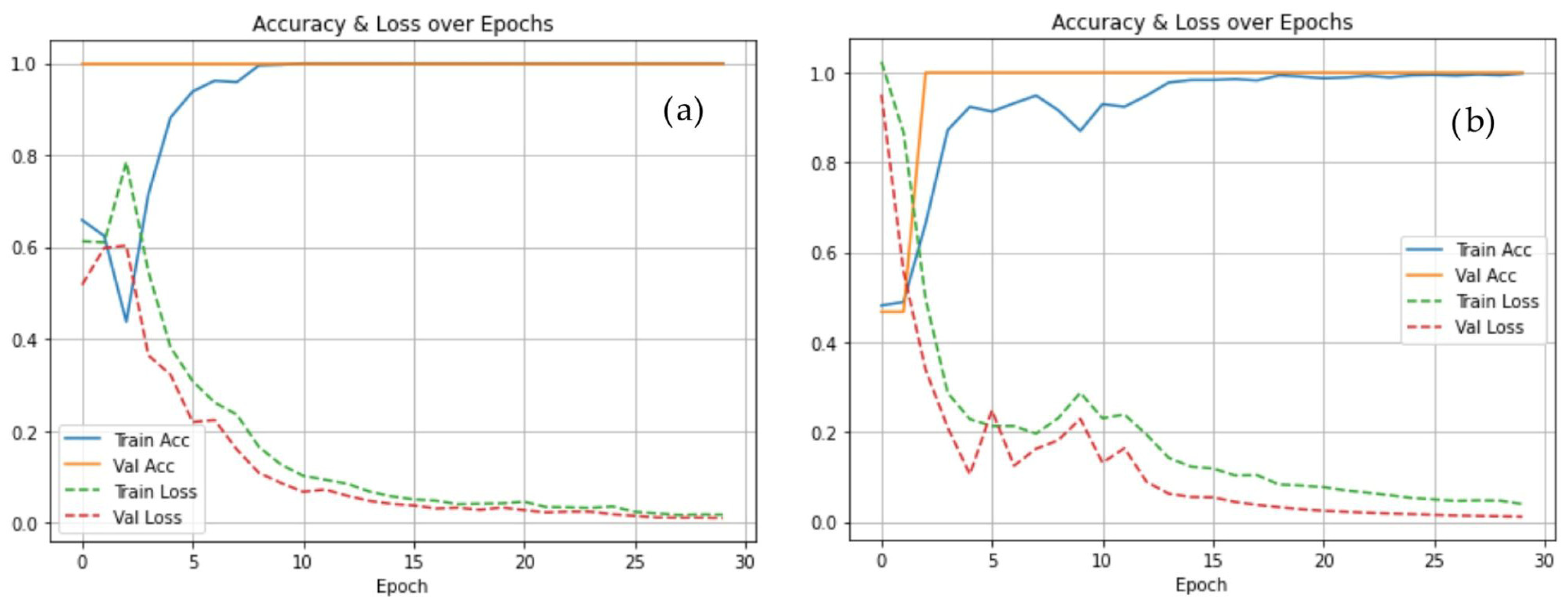 Training and validation loss curves under the selective PD augmentation condition exhibited smooth convergence with limited divergence between curves, suggesting stable learning dynamics within the present validation design. The corresponding accuracy curves showed progressive improvement across epochs, reaching a plateau in the final training stages (