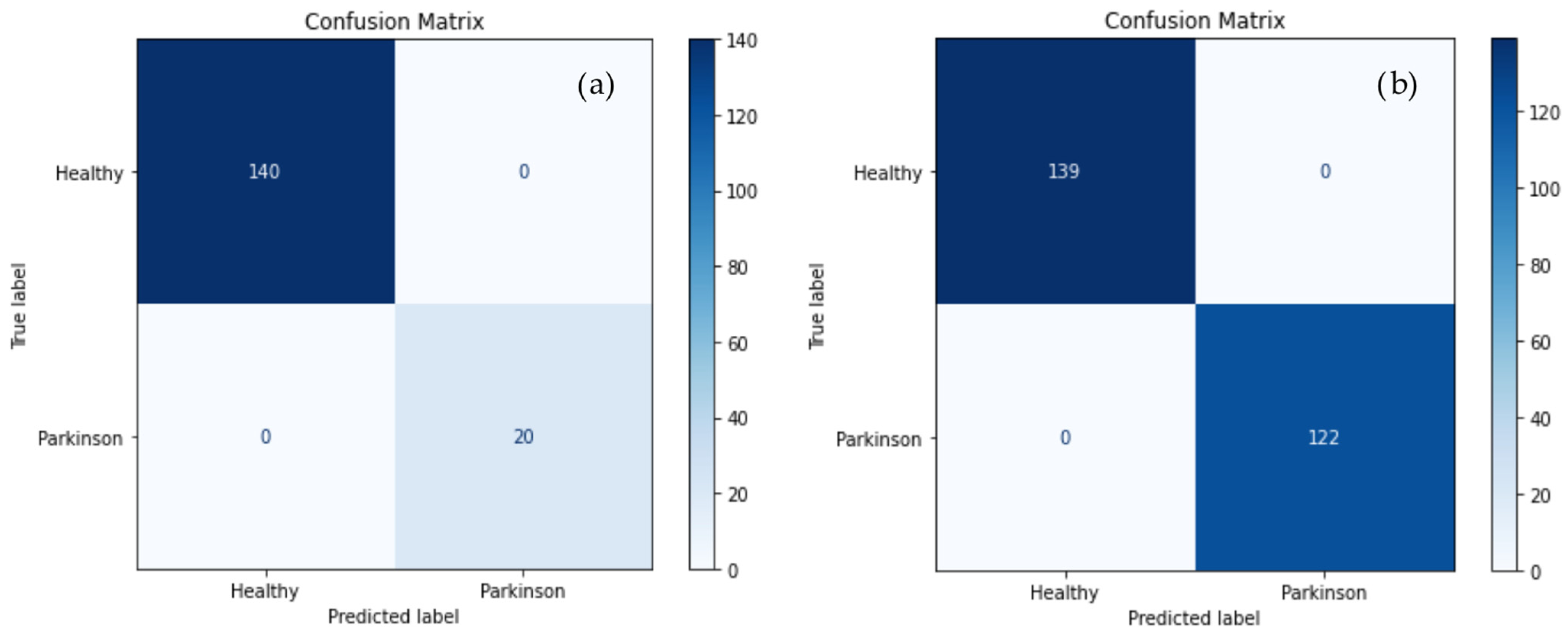 Confusion matrices obtained under selective PD augmentation showed low rates of false positives (healthy classified as PD) and false negatives (PD classified as healthy), indicating improved classification reliability relative to other configurations (