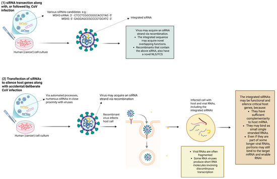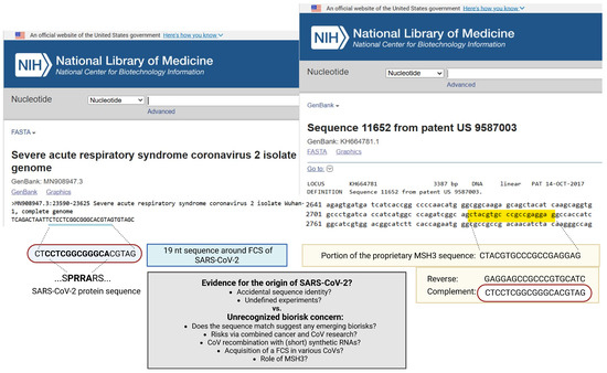 In Ref. [8], a theoretical analysis was conducted to extend the observation made by Ambati and colleagues, aiming to describe the type of experiments that could result in the integration event of the FCS. In brief, this postulate is based on the observation [1] of a 19-nucleotide-long RNA sequence including the FCS which is 100% identical to the reverse complement of a proprietary sequence involving the human mutS homolog (MSH3). The actual sequences in question, based on their respective GenBank records, are depicted in Figure 1. It is essential to reiterate that this is not about the evolution of SARS-CoV-2 but the potential of its integration in a broad context currently not covered by DURC policies and oversight (recapitulated in Table 1). This section summarizes and updates the underpinnings of how such sequence inserts could emerge in CoVs. The following sections extend biorisk implications to cancer research more generally, and also explain the critical role of MSH3, which had previously remained unresolved. In turn, the insights suggest demanding biorisk gaps that will be further discussed in the final sections.