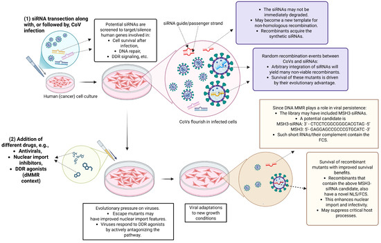 The main consideration in [8] was that a common denominator could be RNA viruses in cancer research. Oncogenic viruses often cause genomic instability, evade immune surveillance, and disrupt cell cycle control [35]. Another key component is the hijacking of DDR by RNA viruses. Based on the rationale that DNA lesions persist via virus-compromised DDR, fostering mutagenesis, several laboratory scenarios could aim to research the virus–host interplay in this particular context: