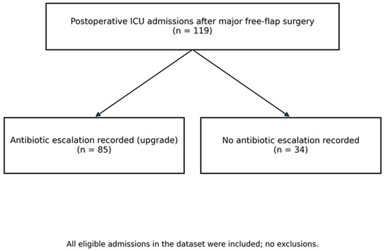 The cohort comprised 119 consecutive postoperative ICU admissions after major free-flap reconstruction. Antibiotic escalation (recorded as ‘upgrade’) occurred in 85/119 admissions (71.4%). Figure 1 summarizes cohort inclusion and group allocation. Perioperative and early postoperative characteristics by antibiotic escalation status are summarized in Table 1.