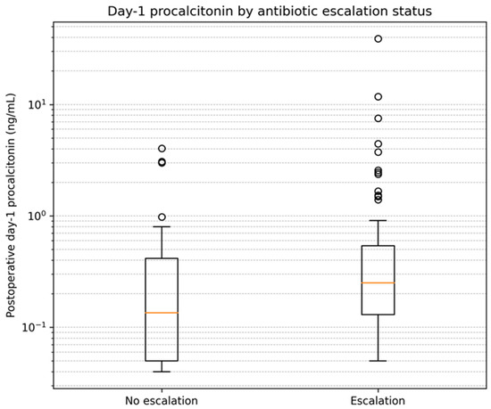 Compared with patients without escalation, those with antibiotic escalation had longer operative times (805 (705–914) vs. 766 (666–822); p = 0.028) and received higher intraoperative IV fluid volumes (5350 (4450–6650) vs. 4725 (3525–5650); p = 0.014). Postoperative day-1 procalcitonin was higher in the escalation group (0.250 (0.130–0.540) vs. 0.135 (0.050–0.415) ng/mL; p = 0.033). Documented postoperative shock and vasopressor use were also more frequent in the escalation group (shock: 59 (69.4%) vs. 13 (38.2%); p = 0.003; vasopressors: 22 (25.9%) vs. 1 (2.9%); p = 0.009). Among admissions with documented postoperative shock, the median time from postoperative time zero to the first recorded shock event was 452.5 min (interquartile range, 257.5–662.5). The distribution of postoperative day-1 procalcitonin by antibiotic escalation status is shown in Figure 2.