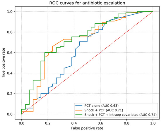 ROC curves showing apparent discrimination for antibiotic escalation. Curves are shown for postoperative day-1 procalcitonin alone, shock plus procalcitonin, and the multivariable model including intraoperative covariates. AUCs represent apparent performance in this retrospective cohort.