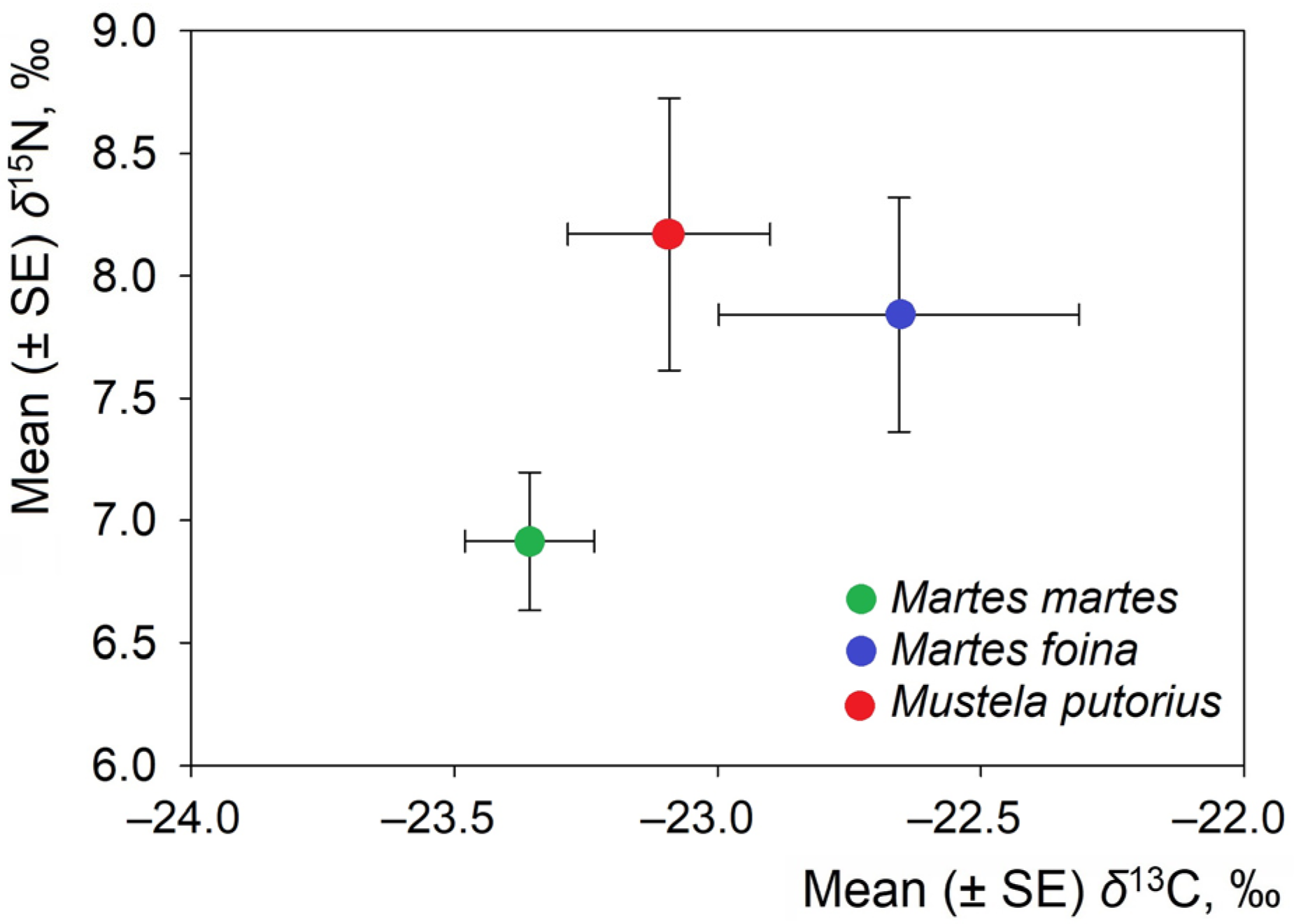 Overall, our findings demonstrate the value of isotopic approaches for assessing trophic relationships among mustelids, showing that species primarily differ in isotopic niche structure rather than in mean isotope values.
