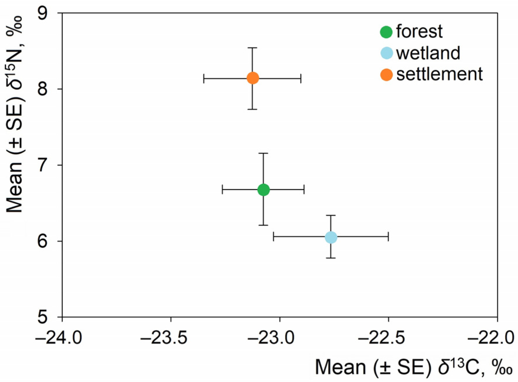 Habitat was associated with variation in nitrogen values: individuals from settlements showed higher δ
