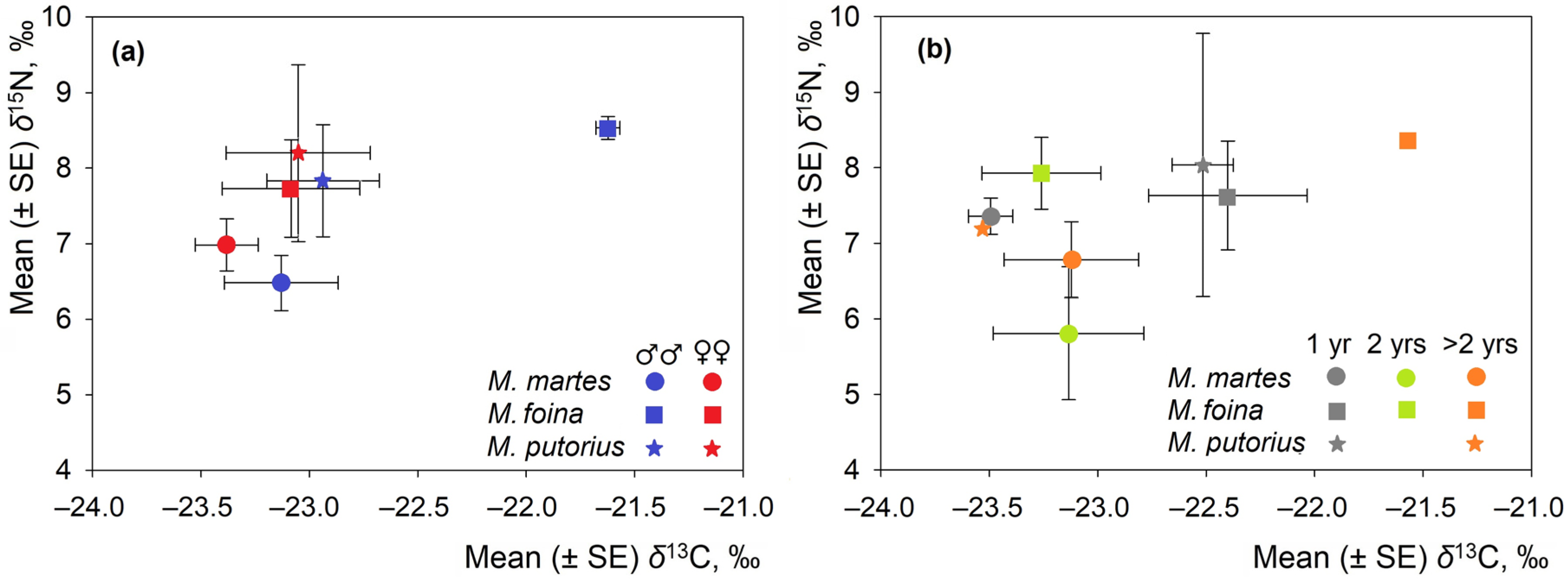 There were no substantial isotopic differences within species based on sex or age. With the exception of a minor difference in δ13C values in M. foina, males and females, as well as juveniles and adults, exhibited similar δ13C and δ15N values. These results suggest that interspecific ecological differences far outweigh intraspecific variation.