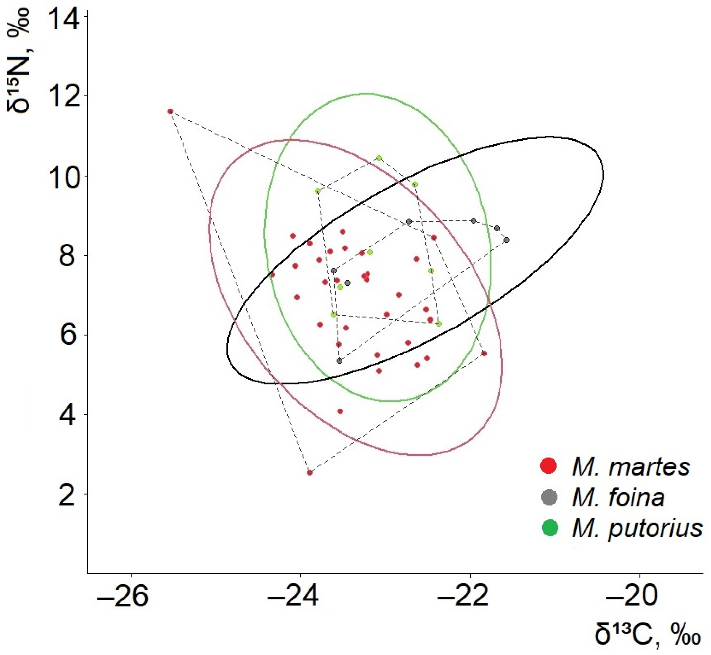 The convex-hull results showed that the narrower isotopic niches of M. foina and M. putorius were nested within the much larger isotopic space of M. martes. This indicates that M. martes’s diet encompasses a richer and more diverse prey landscape.