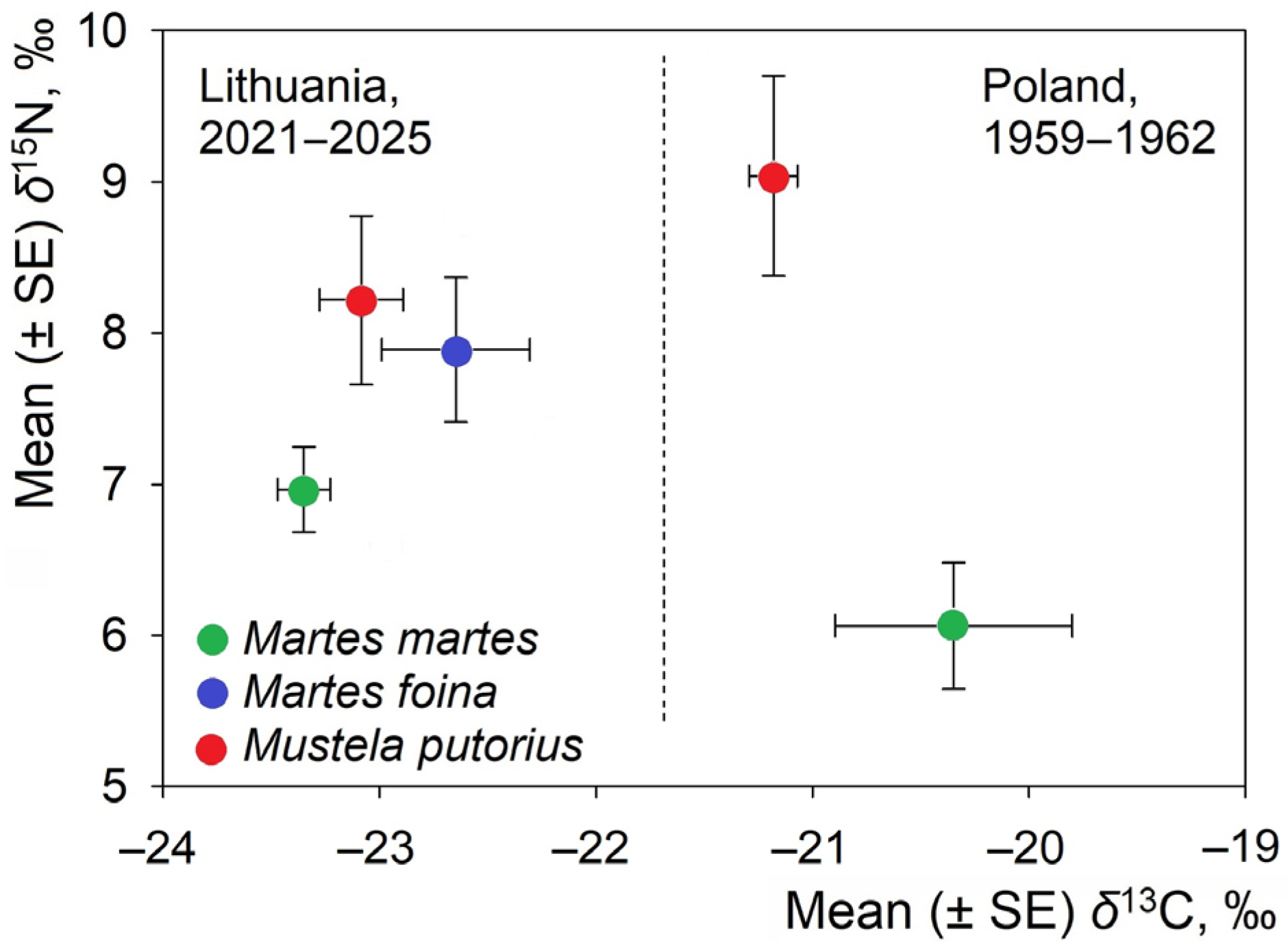 M. putorius shows a stronger dependence on vertebrate-rich diets. The tight clustering and comparatively small error bars for the Lithuanian samples also indicate a relatively cohesive and contemporary environmental isotopic baseline.