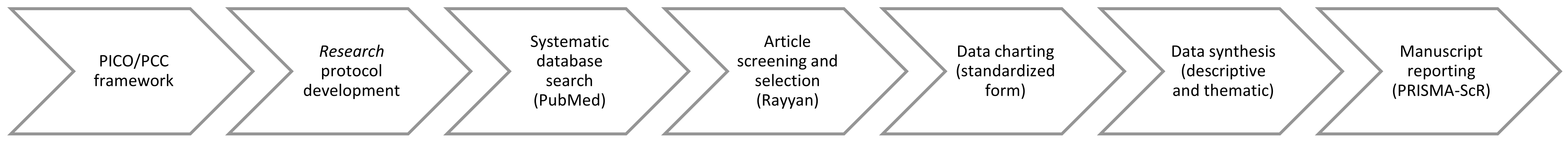 This scoping review followed a research protocol. This protocol has not been registered online and is not currently accessible online. For this reason, the research protocol will be detailed here. In the creation of the protocol, generative AI was used for the preliminary idea generation as well as study design and search syntax refinement. No AI was used in the screening, data extraction, or synthesis process. The methodological framework was in line with the Preferred Reporting Items for Systematic Reviews and Meta-Analyses extension for Scoping Reviews (PRISMA-ScR) guidelines.