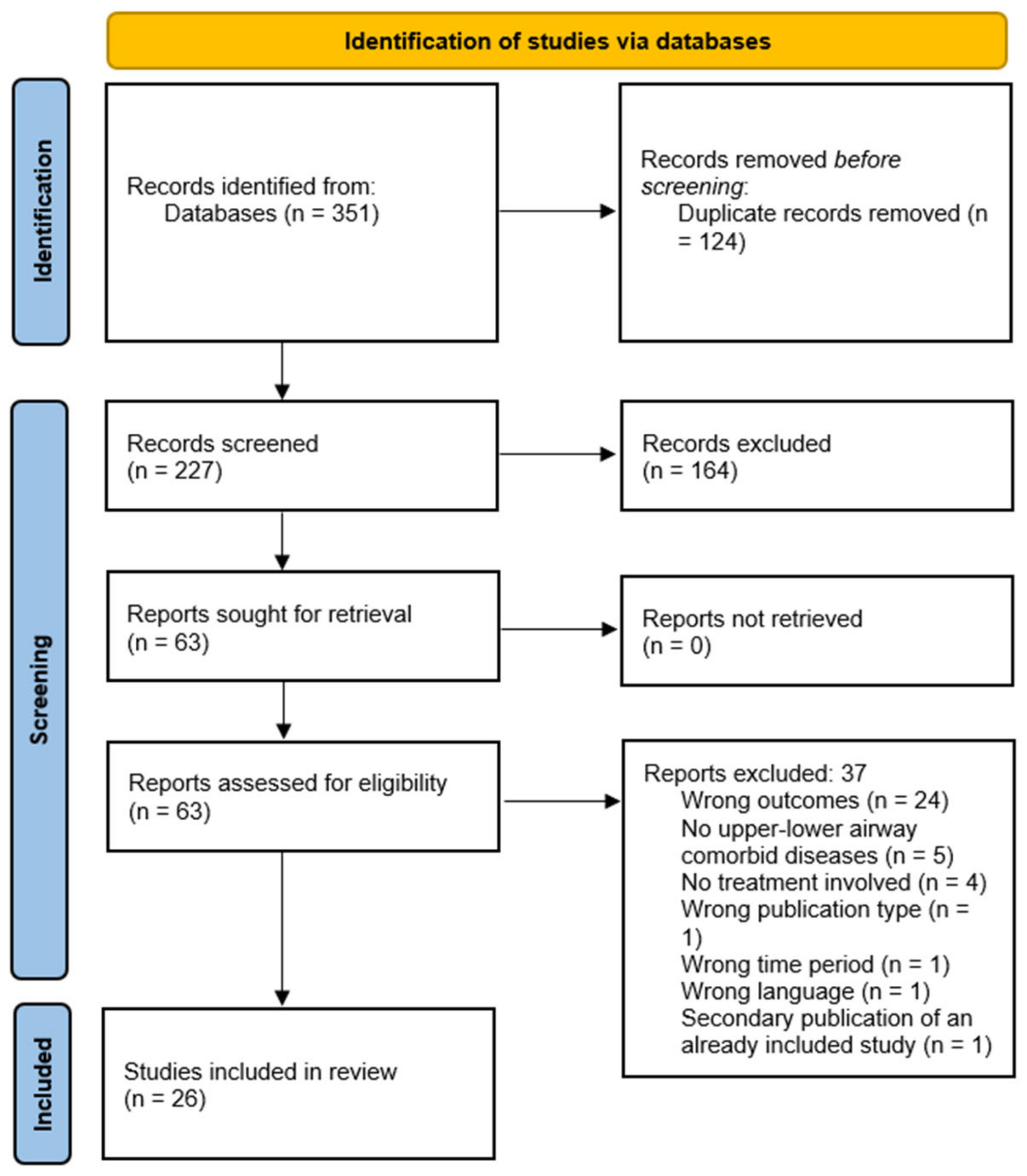 Outcome measures: We identified and recorded all outcomes measured in the included studies, such as symptom scores for upper (e.g., SNOT-22 or visual analog scale) and lower (ACT and ACQ-5) respiratory pathway diseases, quality of life measures, disease control, recurrence rates, and complications. Only studies that contained outcome measures for both the upper and the lower airways were included in the study.
