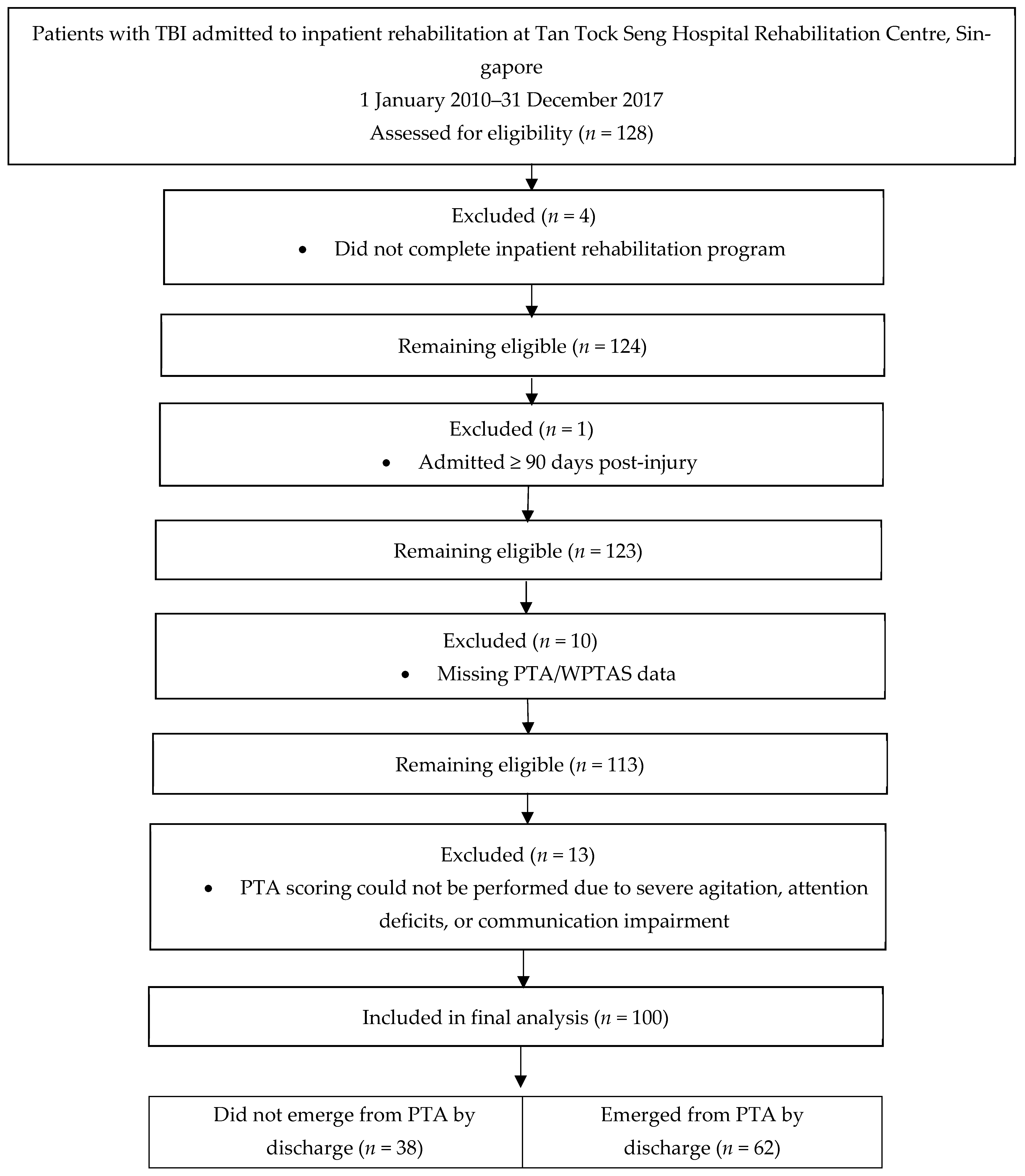 Chicago/Turabian StyleElvina, Tay Kai Wen, Lim Gek Hsiang, and Chua Karen. 2026. "Recovery from Post-Traumatic Amnesia During Inpatient Rehabilitation: A Retrospective Cohort Study" Life 16, no. 2: 221. https://doi.org/10.3390/life16020221