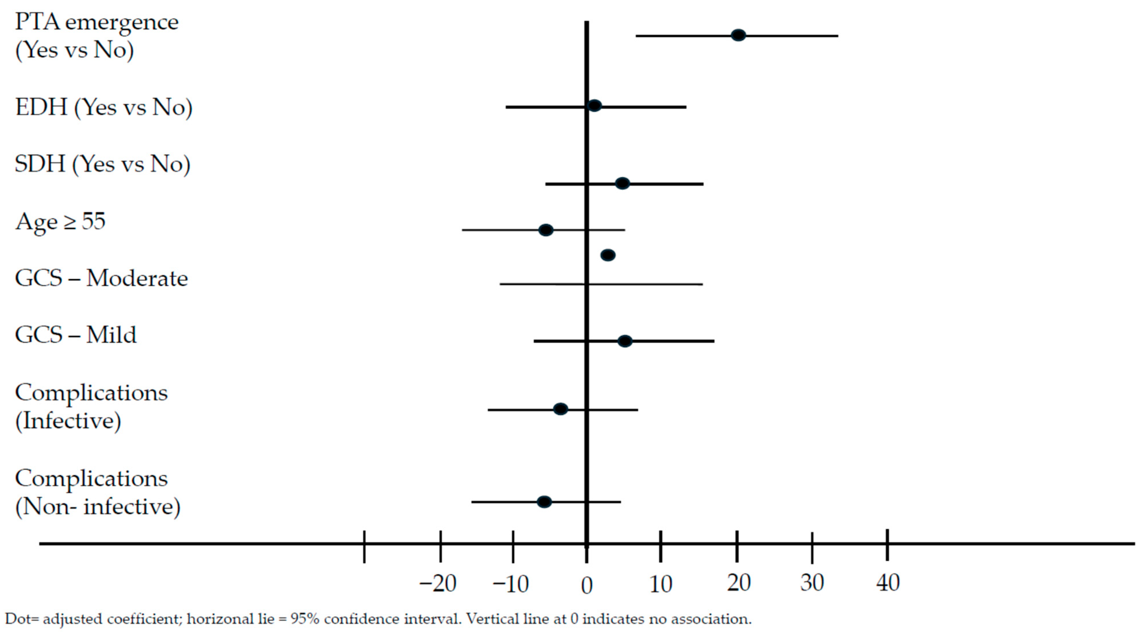 | Moderate GCS 9–12 | 7.39 | −6.39, 21.16 | 0.29 | 2.40 | −11.34, 16.14 | 0.73 |